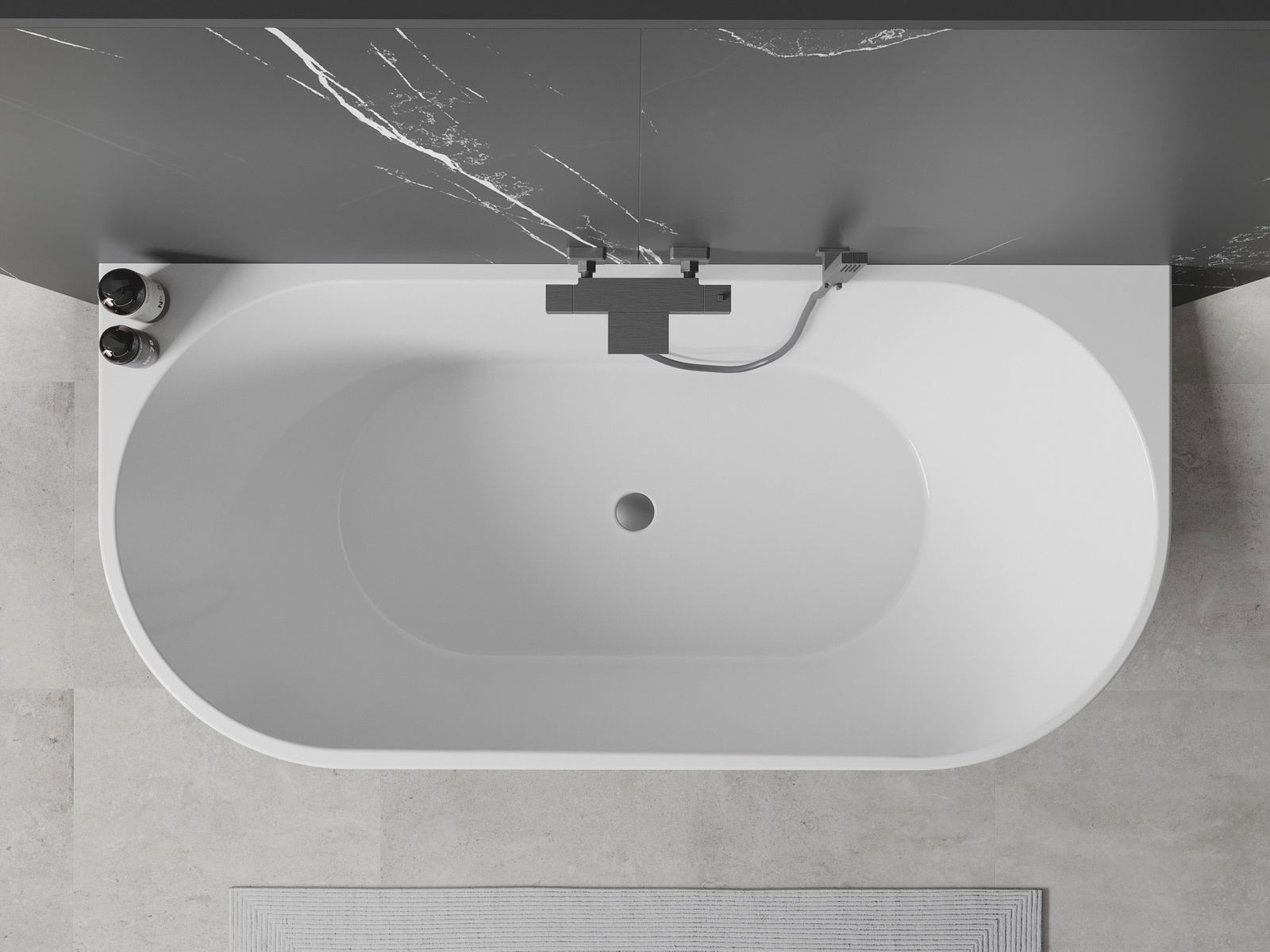 O cadă ovală independentă lipită perete este soluția ideală pentru cei care caută un element modern și stilat în baie. Dimensiunile sale de 180 x 80 cm și înălțimea de 58 cm asigură confortul utilizării, în timp ce execuția din acril sanitar garantează durabilitatea și rezistența la radiațiile UV. Paleta de culori alb-negru combinată cu finisajul elegant gun metal conferă un caracter deosebit. Produsul este echipat cu o scurgere practică în centru și sifon, facilitând montajul și utilizarea zilnică.