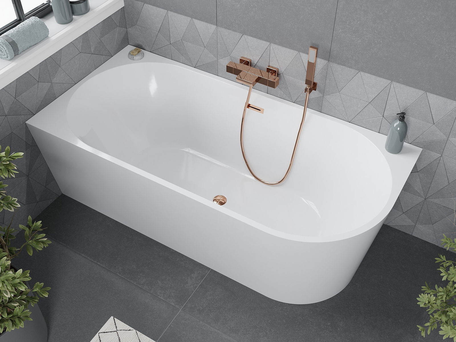 Cadă de baie independentă, colț, se remarcă prin designul modern cu formă dreptunghiulară, potrivită perfect pentru orice baie. Dimensiunile sale de 170 x 80 cm și înălțimea de 58 cm asigură confortul utilizării. Fabricată din acril sanitar, este rezistentă la matifiere și radiații UV, ceea ce garantează durabilitatea. Finisajul spectaculos în aur roz și culoarea albă atractivă o fac un element elegant al interiorului. Setul include sifon și dop click clack, facilitând montajul și utilizarea.