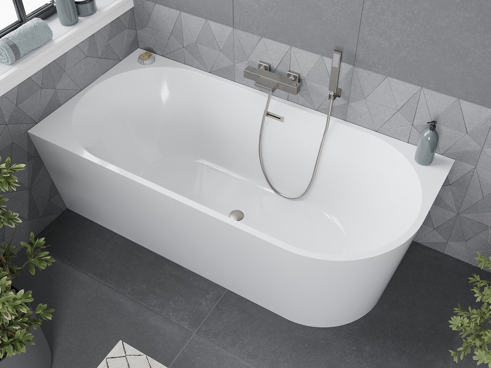 Mexen Mia este o cadă de sine stătătoare elegantă, colțară, oferind spațiu generos datorită dimensiunilor de 180 x 80 cm. Fabricată din acril sanitar, asigură durabilitate și rezistență la matuire și raze UV. Culoarea sa albă stilată, combinată cu finisajul din nichel periat, adaugă un caracter modern oricărei băi. Cada este echipată cu preaplin și un set convenabil de sifon și dop clic-clac. Montajul colțar o face să se potrivească perfect în diverse aranjamente de spațiu.