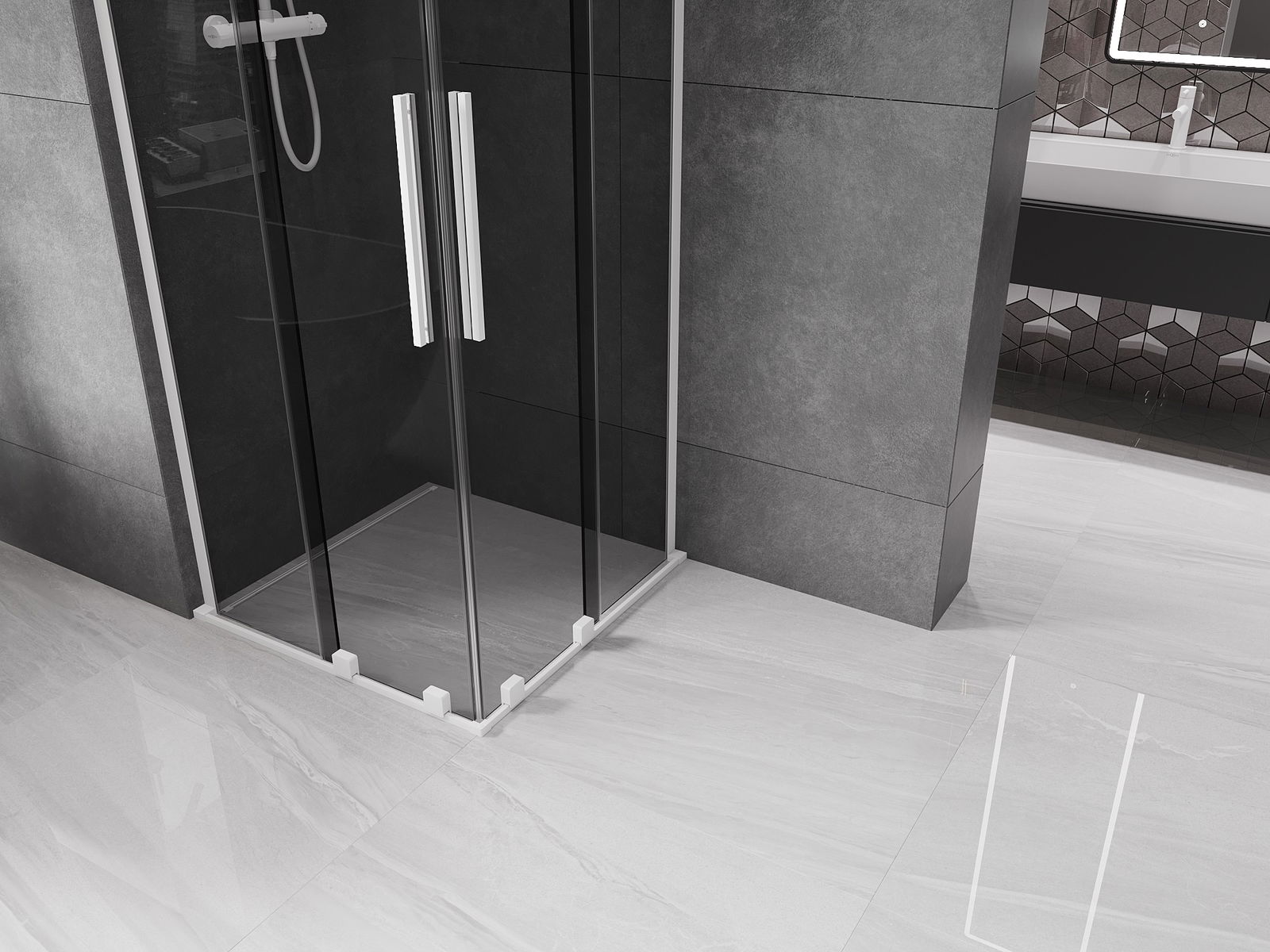 Mânerul practic și confortabil este realizat din oțel inoxidabil. Forma modernă, combinată cu un finisaj asortat cu culoarea profilelor, conferă ansamblului un aspect modern și elegant, subliniind estetica fiecărei băi.