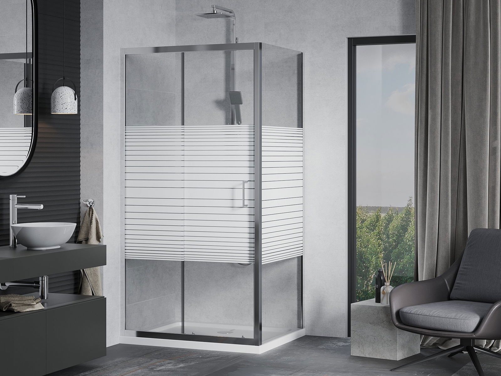 Mânerul la îndemână și confortabil era din metal durabil și rezistent. Forma la modă combinată cu un finisaj adaptat culorii profilurilor oferă întregului aspect modern și elegant, subliniind estetica fiecărei băi.