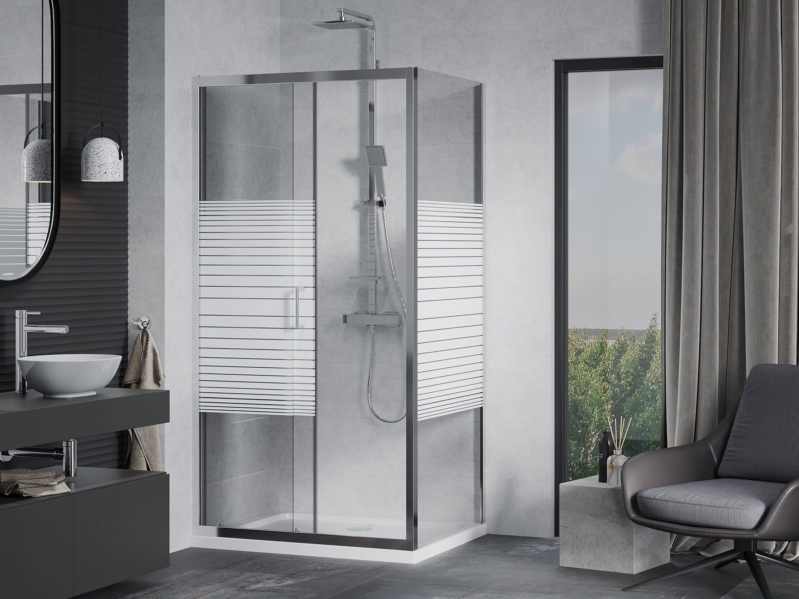 Mexen Apia cabina de duș glisantă 140 x 70 cm, dungi albe, crom + cadă de duș Flat - 840-140-070-01-20-4010