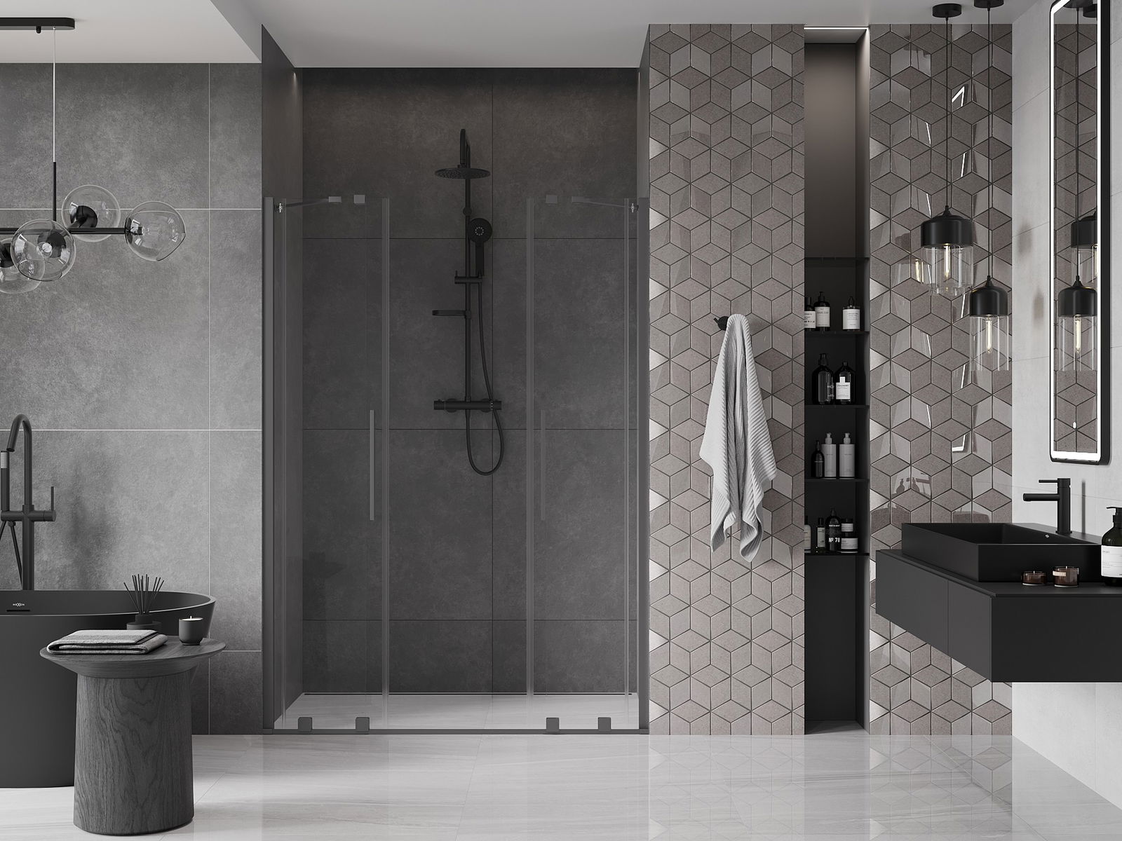 Mânerul practic și confortabil este realizat din oțel inoxidabil. Forma modernă, combinată cu un finisaj asortat cu culoarea profilelor, conferă ansamblului un aspect modern și elegant, subliniind estetica fiecărei băi.
