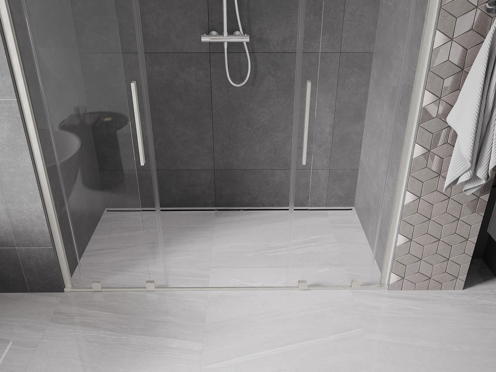 Mânerul practic și confortabil este realizat din oțel inoxidabil. Forma modernă, combinată cu un finisaj asortat cu culoarea profilelor, conferă ansamblului un aspect modern și elegant, subliniind estetica fiecărei băi.