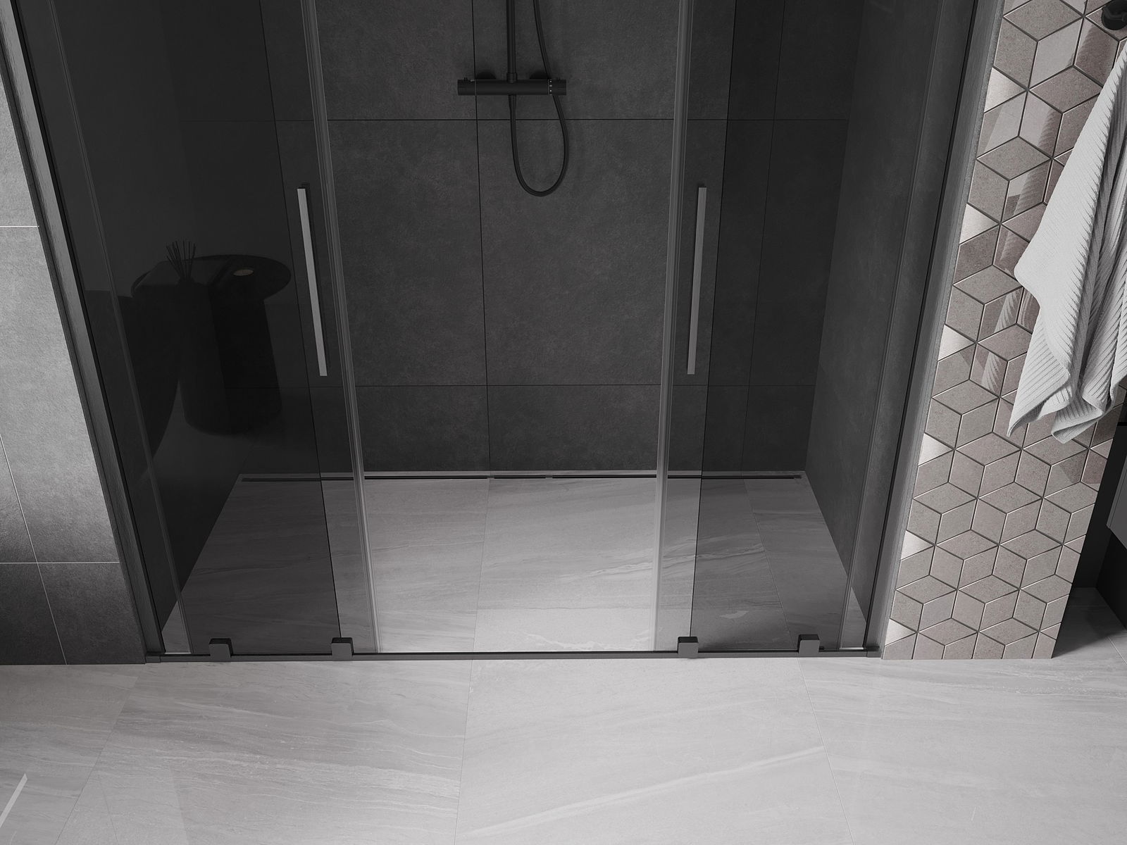 Mânerul practic și confortabil este realizat din oțel inoxidabil. Forma modernă, combinată cu un finisaj asortat cu culoarea profilelor, conferă ansamblului un aspect modern și elegant, subliniind estetica fiecărei băi.