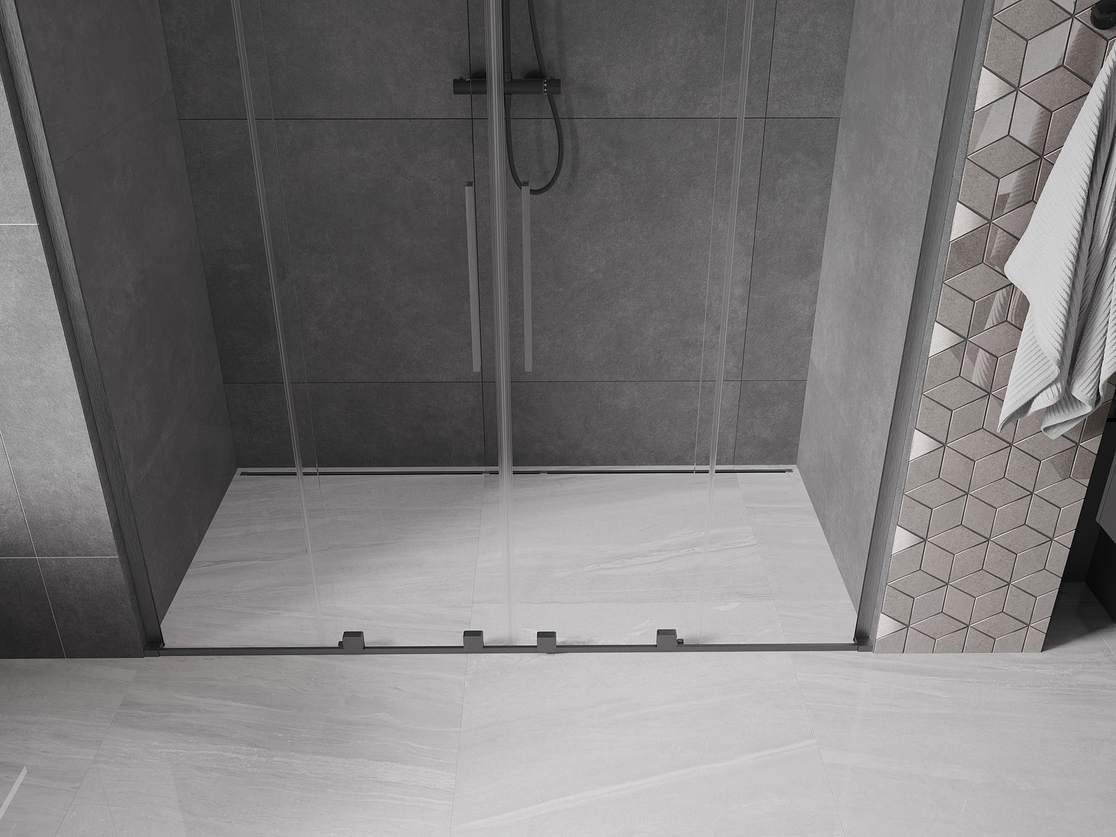 Mânerul practic și confortabil este realizat din oțel inoxidabil. Forma modernă, combinată cu un finisaj asortat cu culoarea profilelor, conferă ansamblului un aspect modern și elegant, subliniind estetica fiecărei băi.