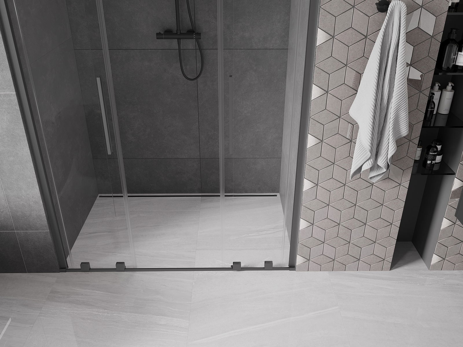 Mânerul practic și confortabil este realizat din oțel inoxidabil. Forma modernă, combinată cu un finisaj asortat cu culoarea profilelor, conferă ansamblului un aspect modern și elegant, subliniind estetica fiecărei băi.