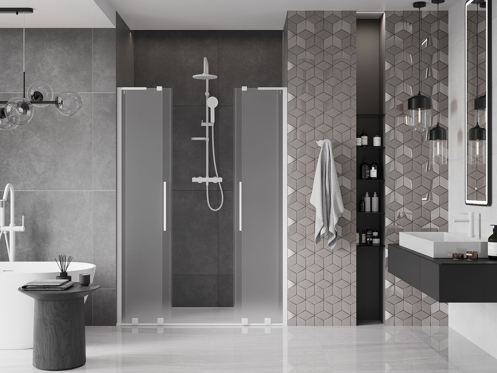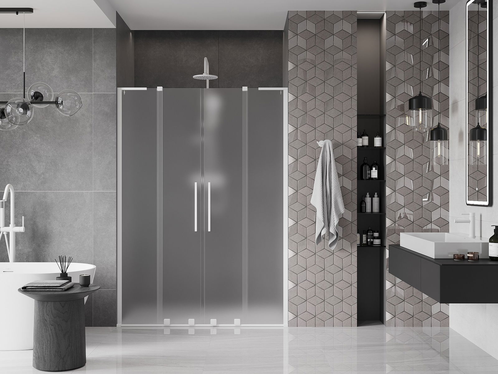 Mânerul practic și confortabil este realizat din oțel inoxidabil. Forma modernă, combinată cu un finisaj asortat cu culoarea profilelor, conferă ansamblului un aspect modern și elegant, subliniind estetica fiecărei băi.