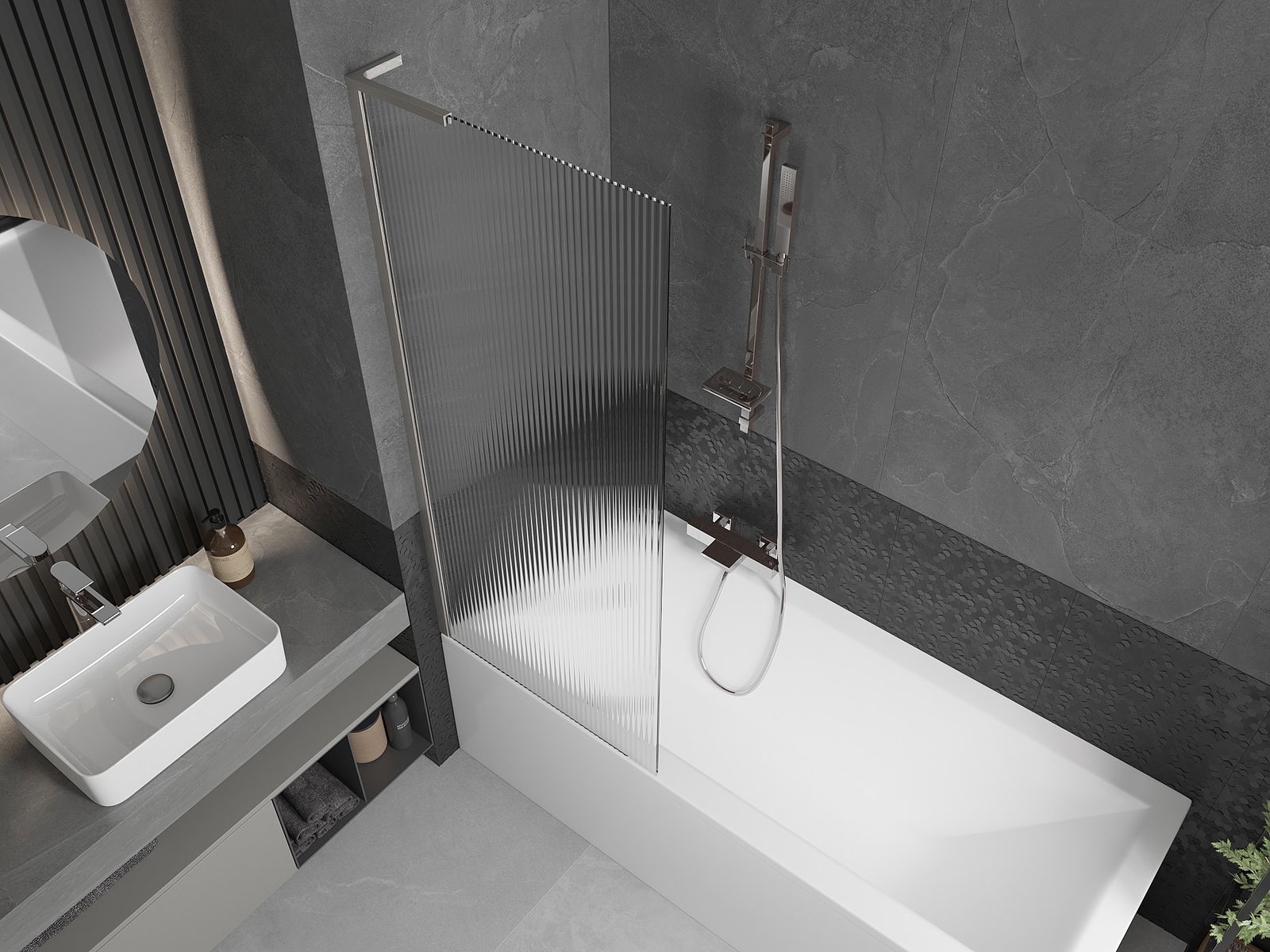 O protecție eficientă împotriva vărsării apei în timpul băii. Paravanul are garnituri care se potrivesc perfect cu suprafața de sticlă și marginea căzii. O soluție funcțională care asigură siguranță și întreținere ușoară a curățeniei.