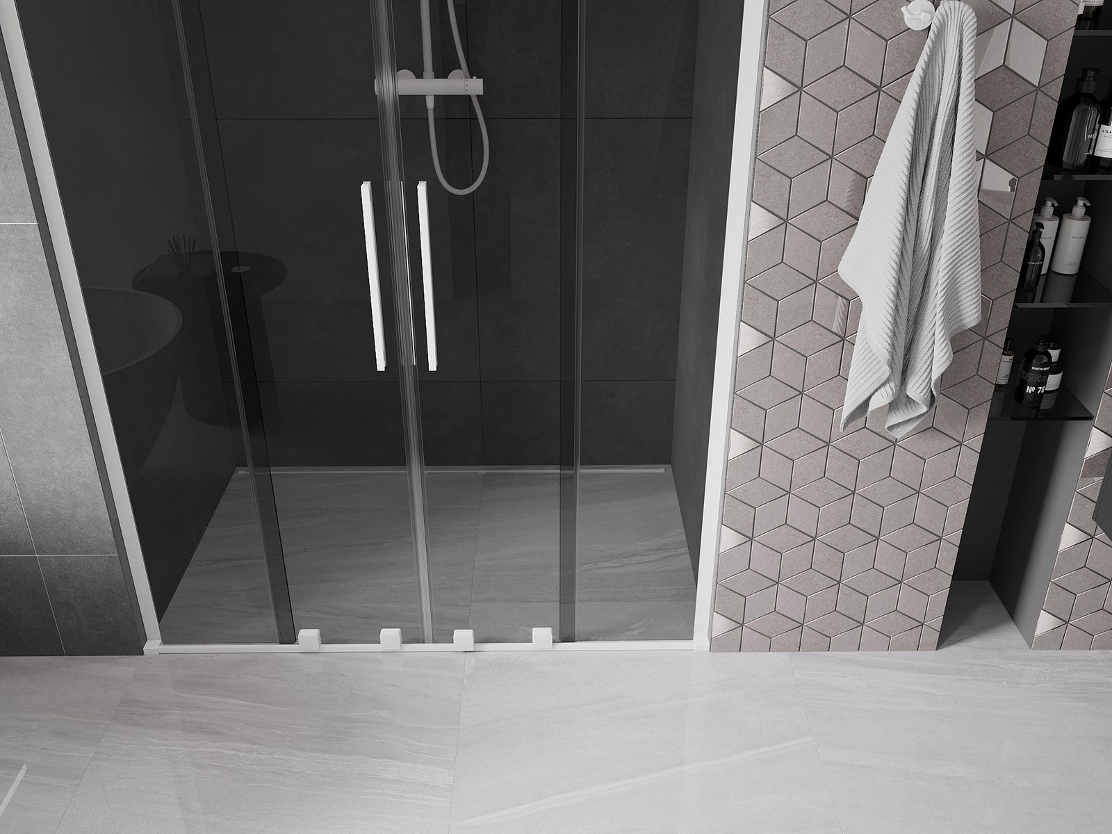 Mânerul practic și confortabil este realizat din oțel inoxidabil. Forma modernă, combinată cu un finisaj asortat cu culoarea profilelor, conferă ansamblului un aspect modern și elegant, subliniind estetica fiecărei băi.