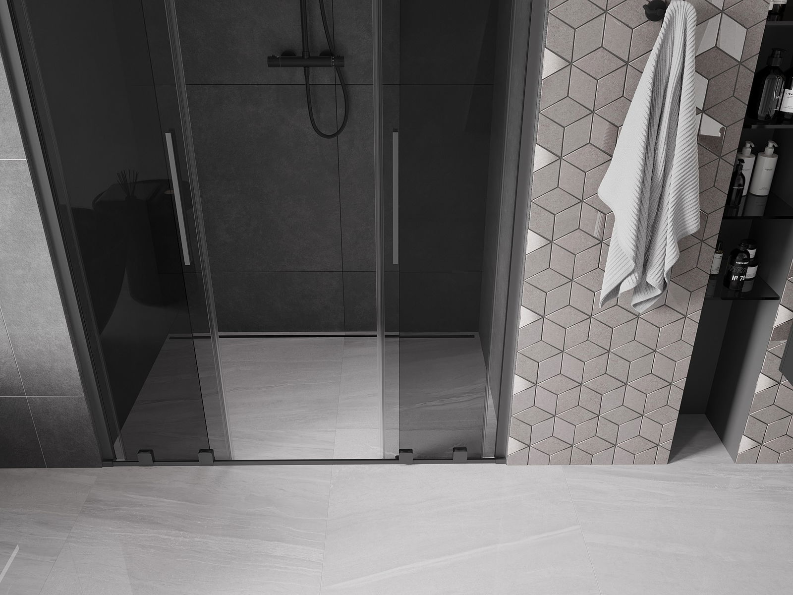 Mânerul practic și confortabil este realizat din oțel inoxidabil. Forma modernă, combinată cu un finisaj asortat cu culoarea profilelor, conferă ansamblului un aspect modern și elegant, subliniind estetica fiecărei băi.