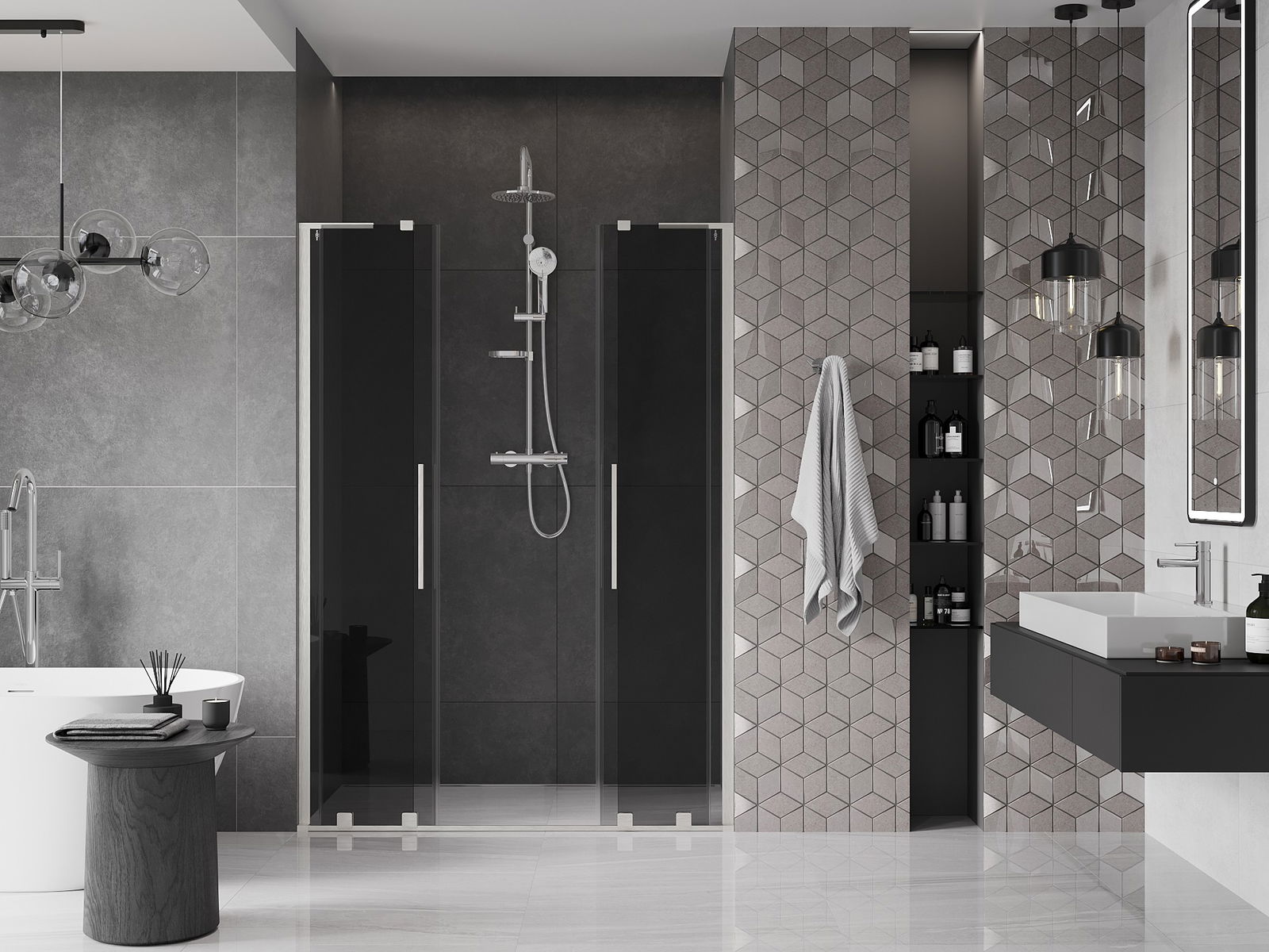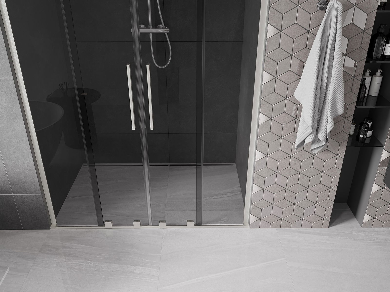 Mânerul practic și confortabil este realizat din oțel inoxidabil. Forma modernă, combinată cu un finisaj asortat cu culoarea profilelor, conferă ansamblului un aspect modern și elegant, subliniind estetica fiecărei băi.