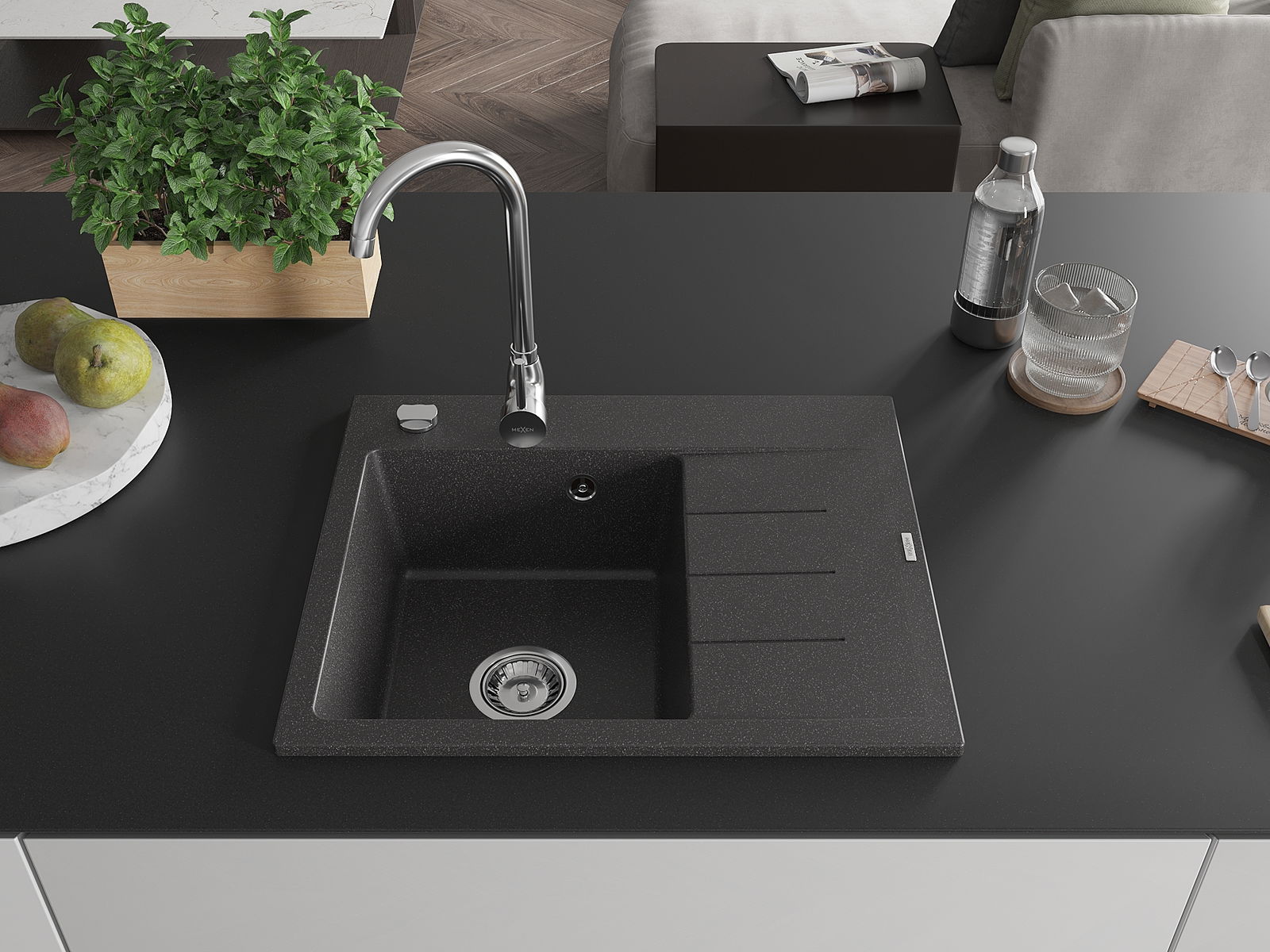 Mexen Ben chiuvetă de granit cu o cuvă și scurgător, stânga 600 x 500 mm, negru pătat, sifon crom - 6522605000-76