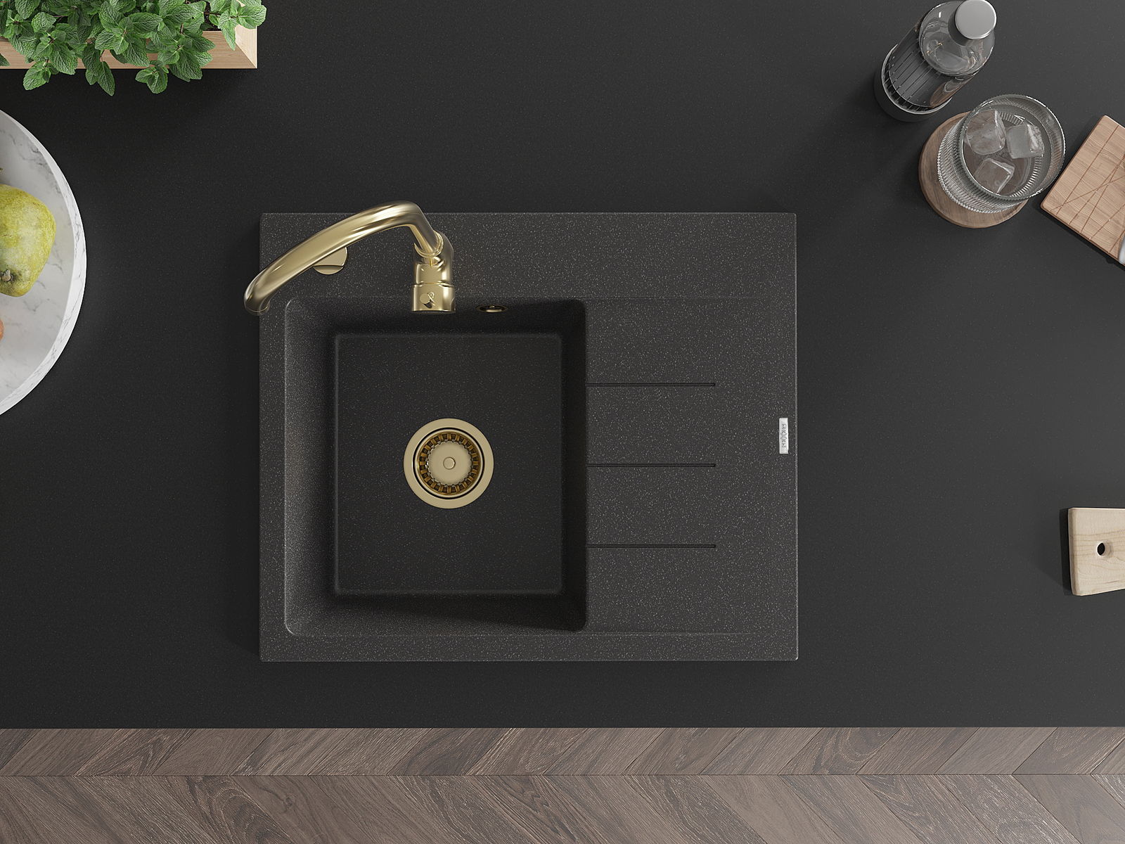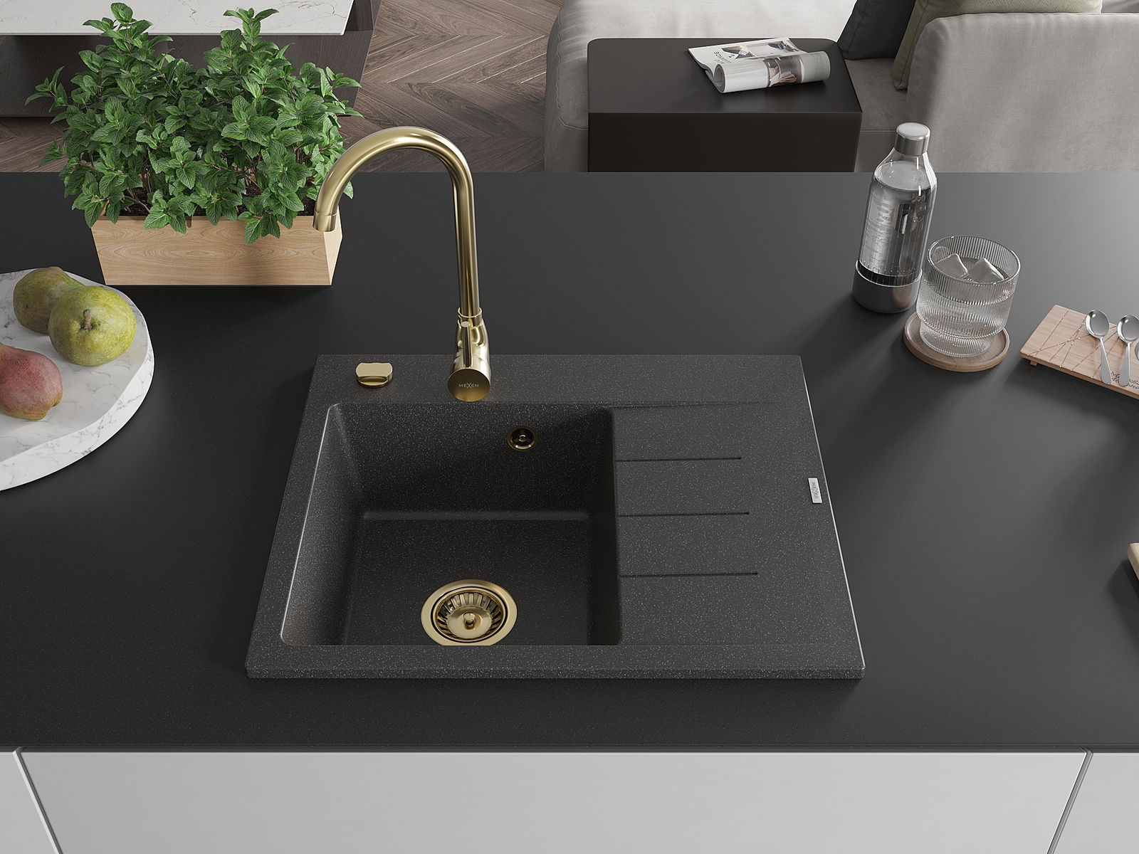 Mexen Ben chiuvetă de granit cu 1 compartiment și scurgător, stânga, 600 x 500 mm, negru cu pete, sifon auriu