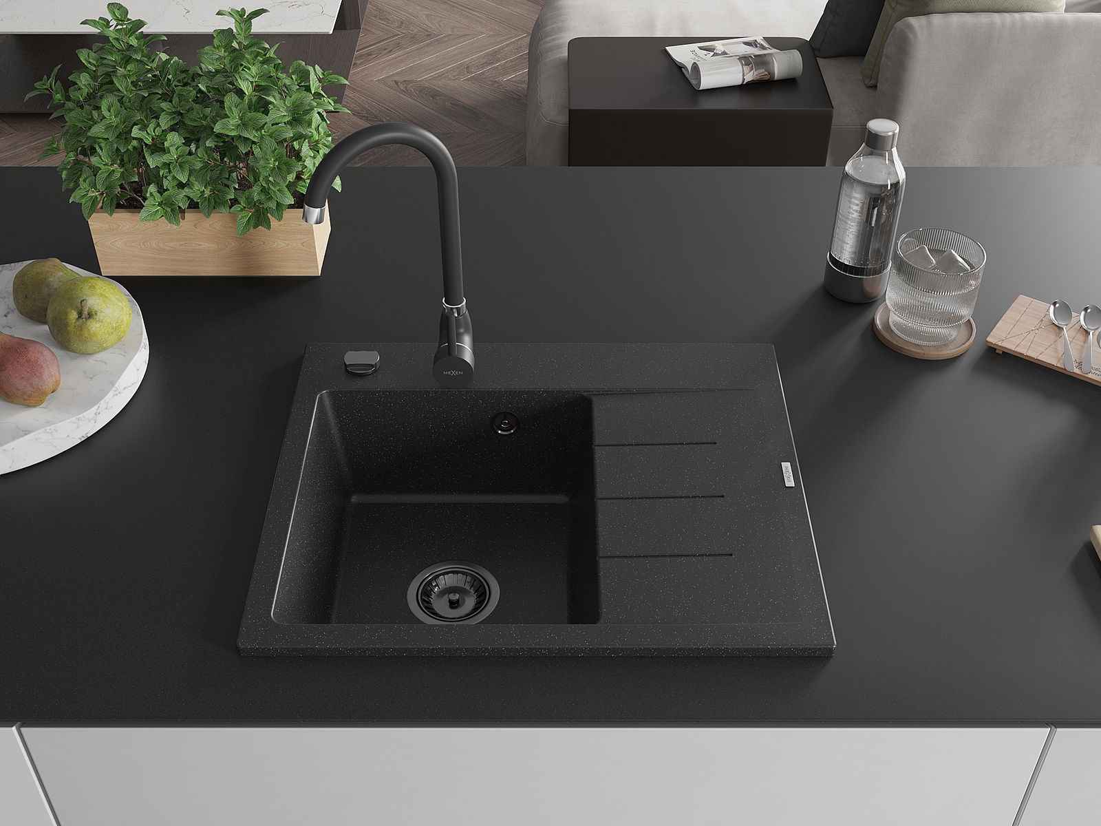 Mexen Ben chiuvetă din granit cu 1 compartiment cu scurgător, stânga 600 x 500 mm negru/argintiu metalic sifon negru