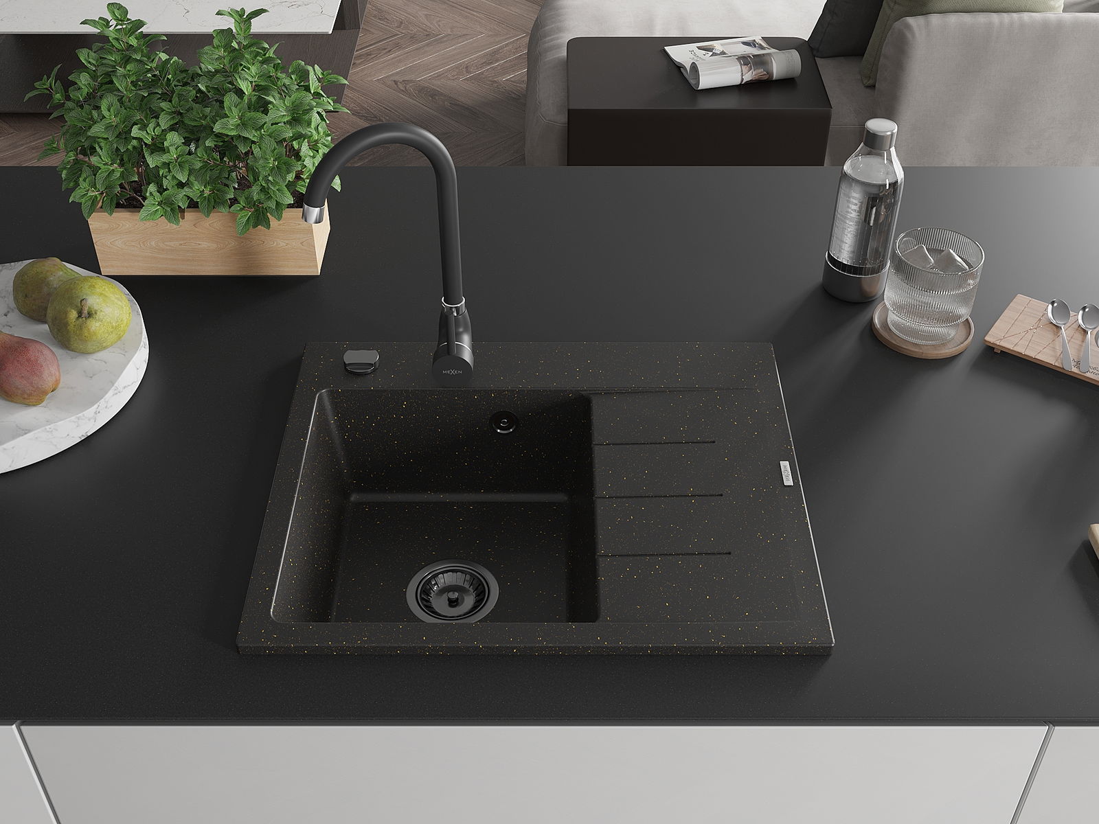 Mexen Ben chiuvetă de granit cu o singură cuvă și scurgător, stânga 600 x 500 mm, negru/auriu metalic, sifon negru