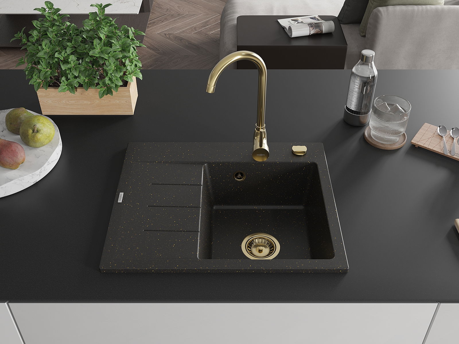 Mexen Ben chiuvetă de granit cu 1 cuvă și picurător, dreapta 600 x 500 mm, negru/auriu metalic, sifon auriu