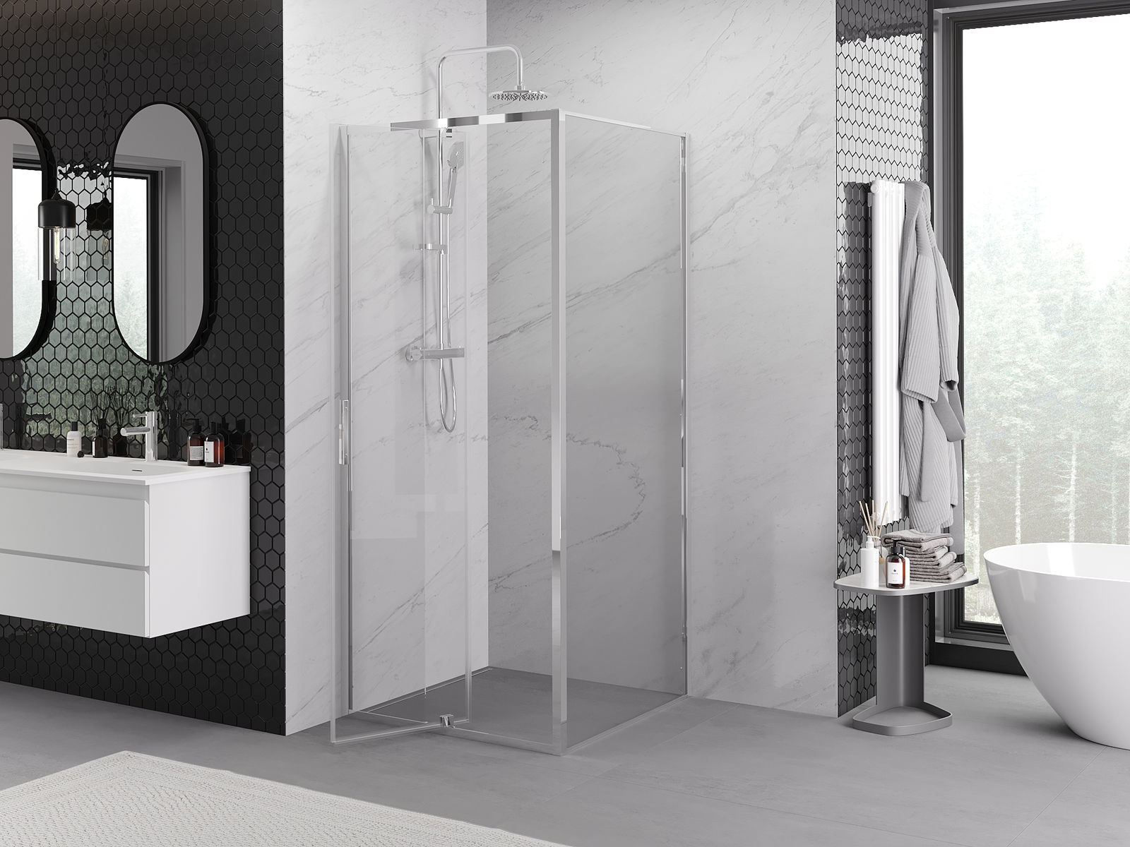 Mânerul practic și confortabil este realizat din metal durabil și rezistent. Forma modernă, combinată cu un finisaj asortat cu culoarea profilelor, conferă un aspect modern și elegant întregului, subliniind estetica fiecărei băi.