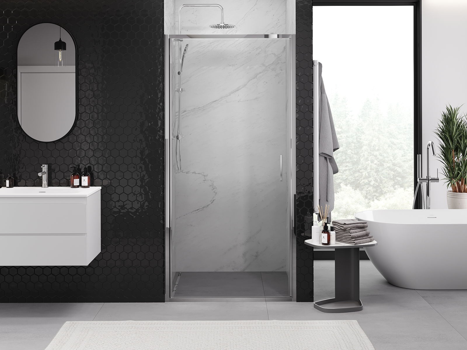 Mânerul practic și confortabil este realizat din metal durabil și rezistent. Forma modernă, combinată cu un finisaj asortat cu culoarea profilelor, conferă un aspect modern și elegant întregului, subliniind estetica fiecărei băi.