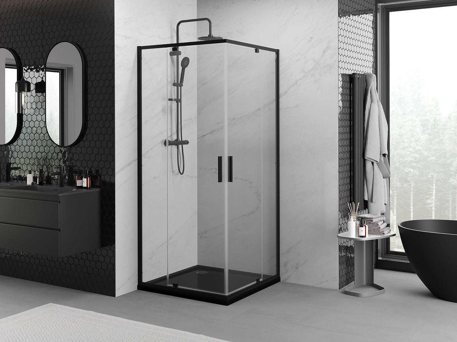 Mexen Exo cabină de duș pătrată cu uși batante 90 x 90 cm, transparentă, neagră - 8110-090-090-70-00