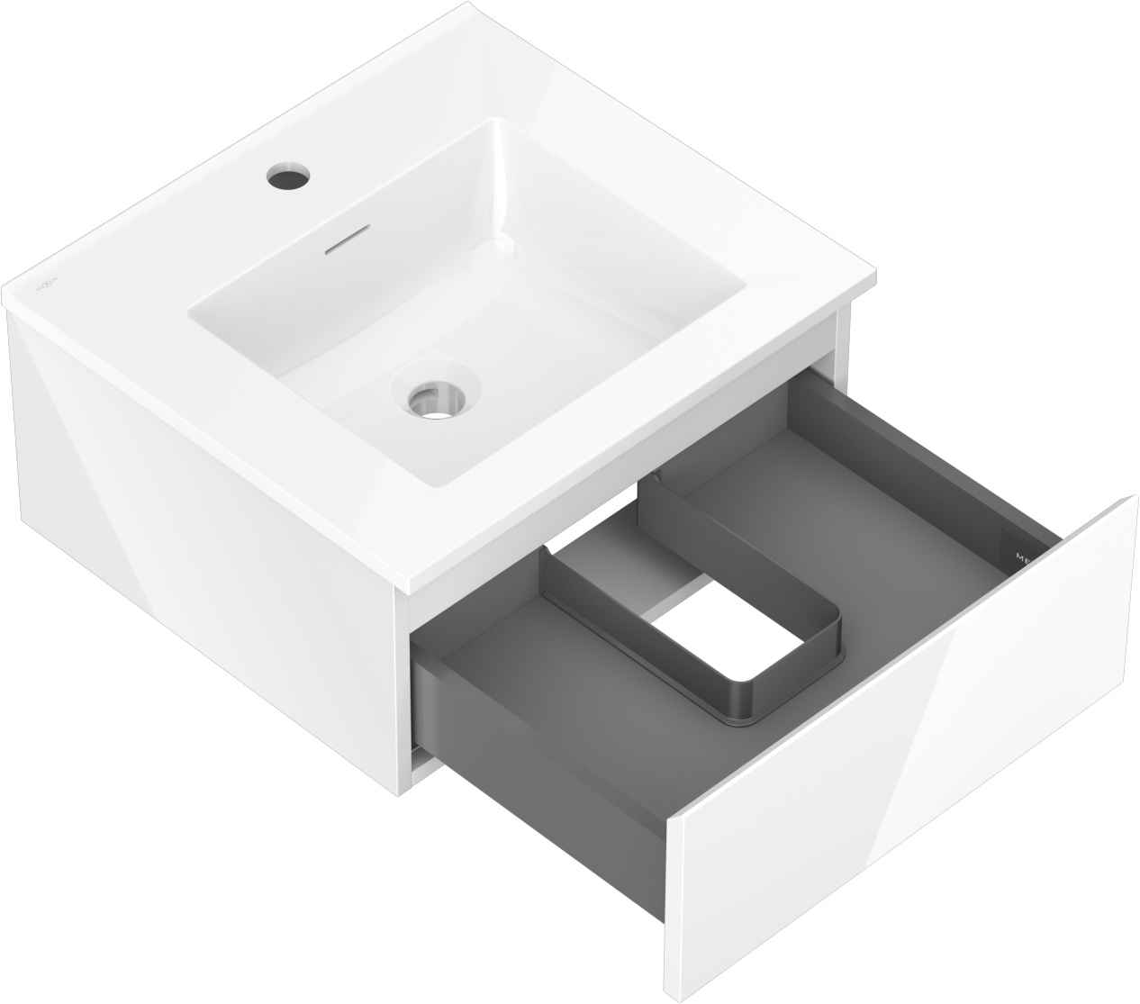 Decupajul în sertar este proiectat în așa fel încât să acomodeze sifonul, care este esențial în instalațiile de lavoare. Datorită acestui fapt, mobila poate fi montată complet funcțională, fără a fi necesară renunțarea la spațiul din sertar în favoarea instalației.