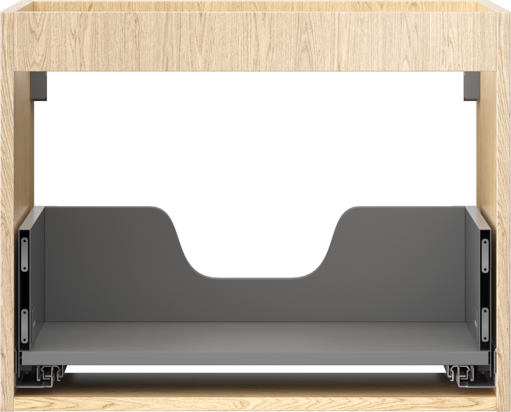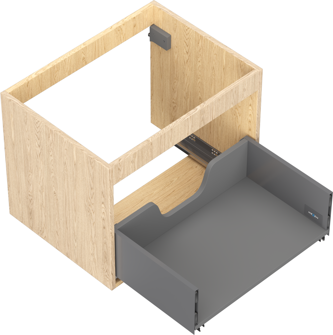 Decupajul în sertar este proiectat în așa fel încât să acomodeze sifonul, care este esențial în instalațiile de lavoare. Datorită acestui fapt, mobila poate fi montată complet funcțională, fără a fi necesară renunțarea la spațiul din sertar în favoarea instalației.