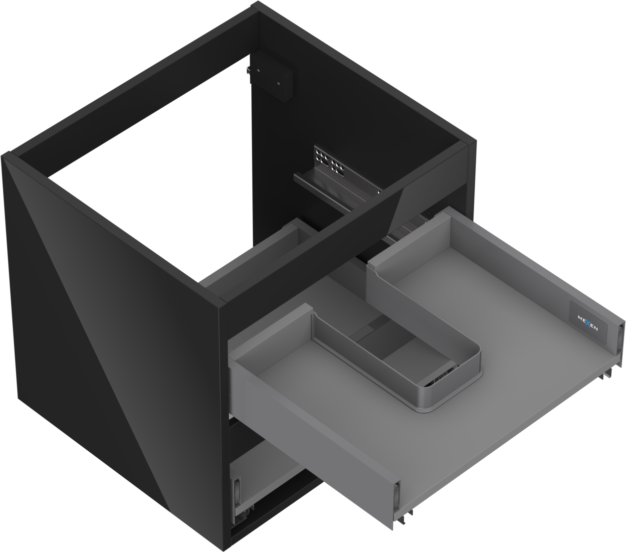 Decupajul în sertar este proiectat în așa fel încât să acomodeze sifonul, care este esențial în instalațiile de lavoare. Datorită acestui fapt, mobila poate fi montată complet funcțională, fără a fi necesară renunțarea la spațiul din sertar în favoarea instalației.