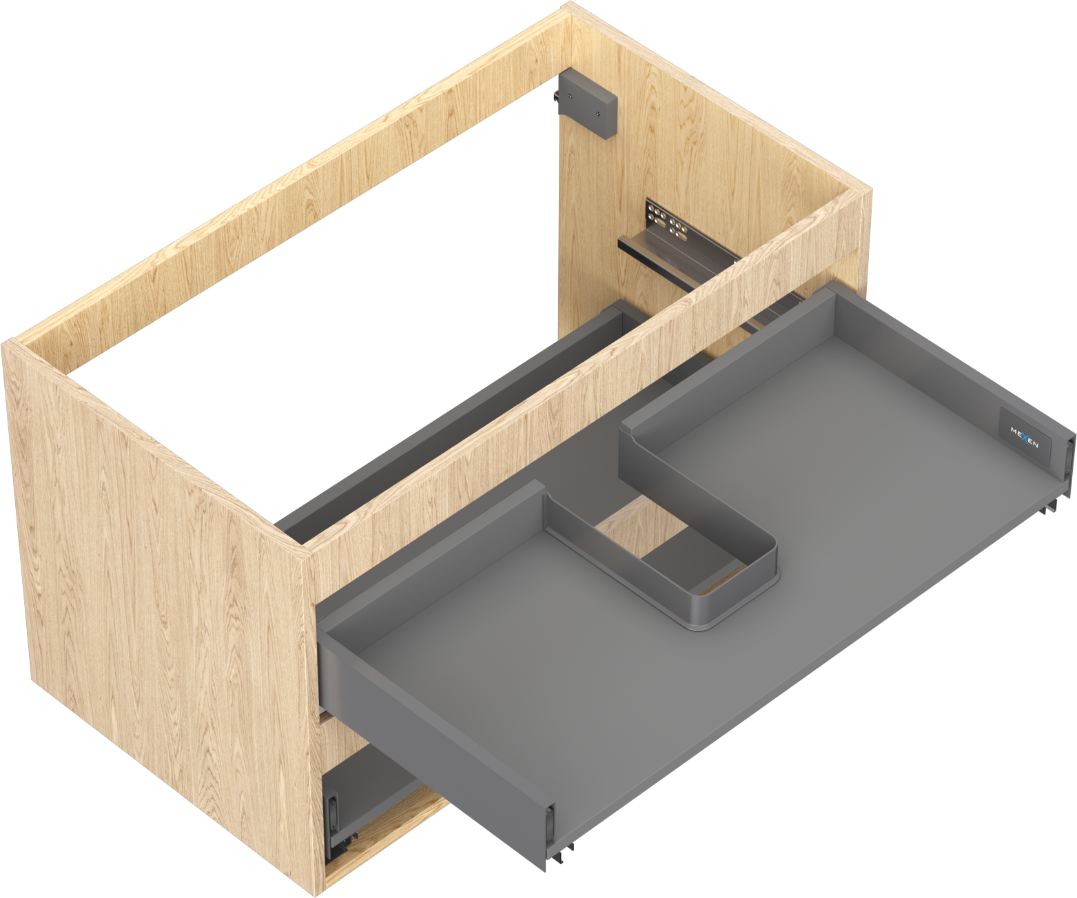 Decupajul în sertar este proiectat în așa fel încât să acomodeze sifonul, care este esențial în instalațiile de lavoare. Datorită acestui fapt, mobila poate fi montată complet funcțională, fără a fi necesară renunțarea la spațiul din sertar în favoarea instalației.