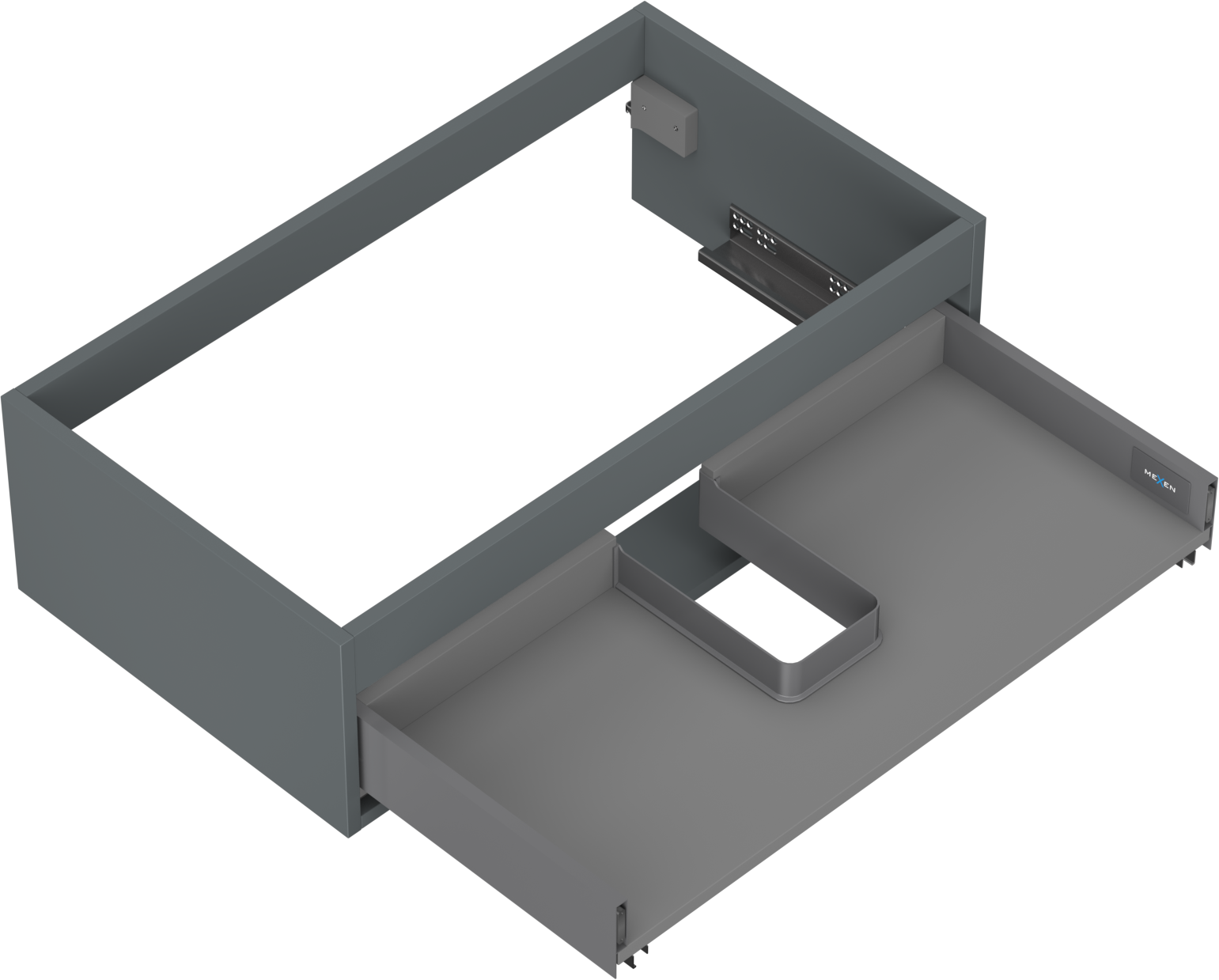Decupajul în sertar este proiectat în așa fel încât să acomodeze sifonul, care este esențial în instalațiile de lavoare. Datorită acestui fapt, mobila poate fi montată complet funcțională, fără a fi necesară renunțarea la spațiul din sertar în favoarea instalației.