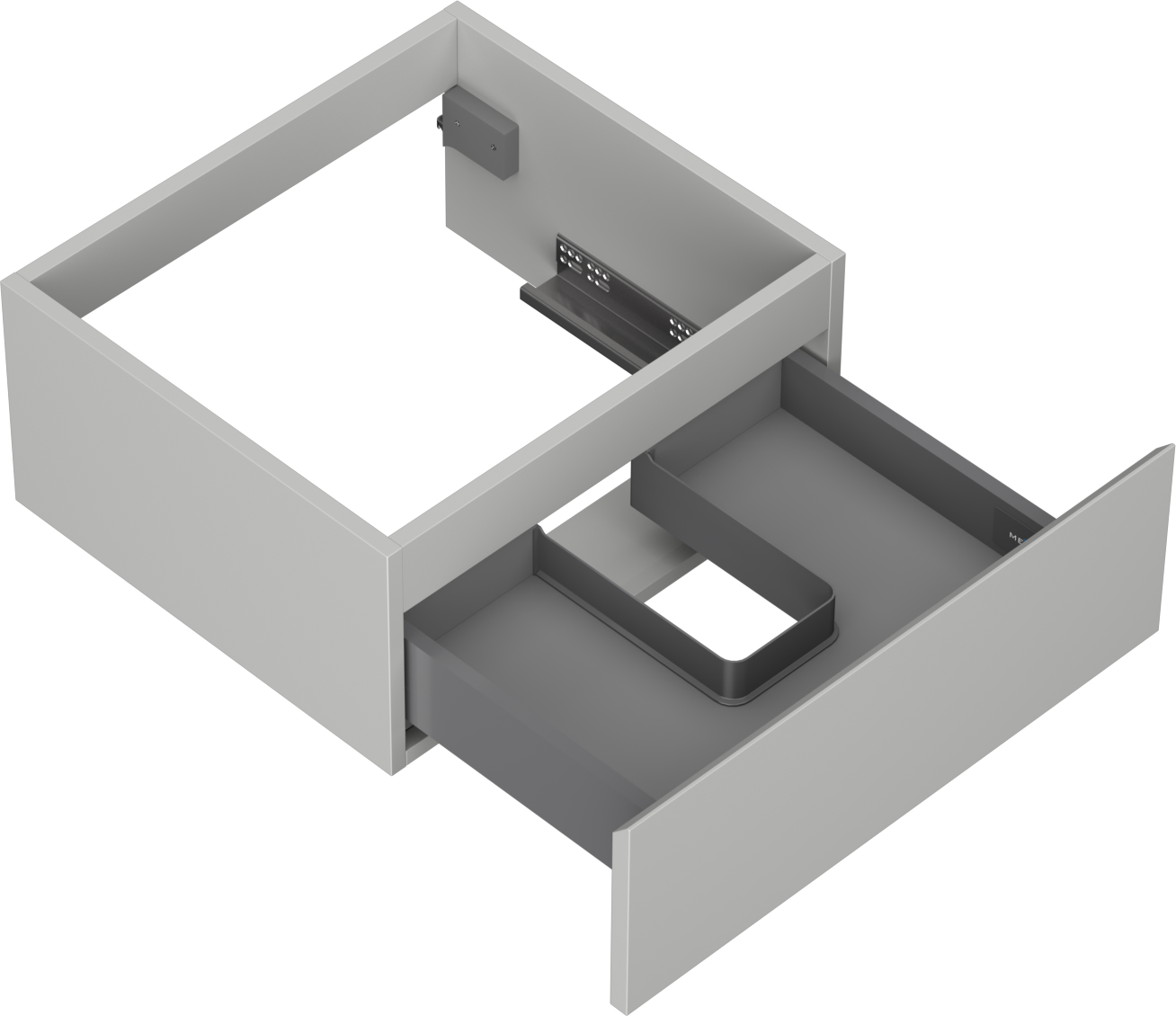 Decupajul în sertar este proiectat în așa fel încât să acomodeze sifonul, care este esențial în instalațiile de lavoare. Datorită acestui fapt, mobila poate fi montată complet funcțională, fără a fi necesară renunțarea la spațiul din sertar în favoarea instalației.