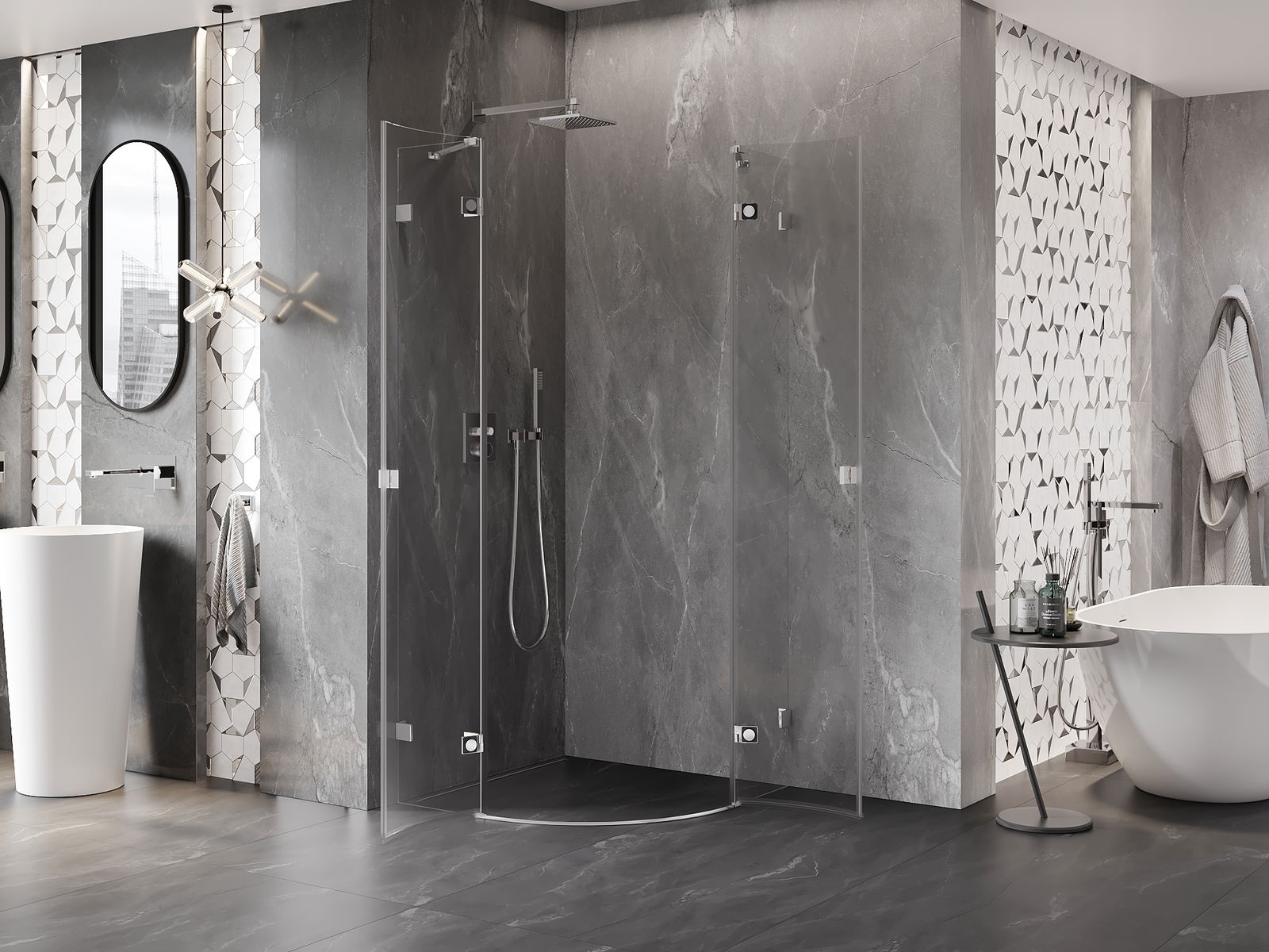 Mânerul practic și confortabil este realizat din metal durabil și rezistent. Forma modernă, combinată cu un finisaj asortat cu culoarea profilelor, conferă un aspect modern și elegant întregului, subliniind estetica fiecărei băi.