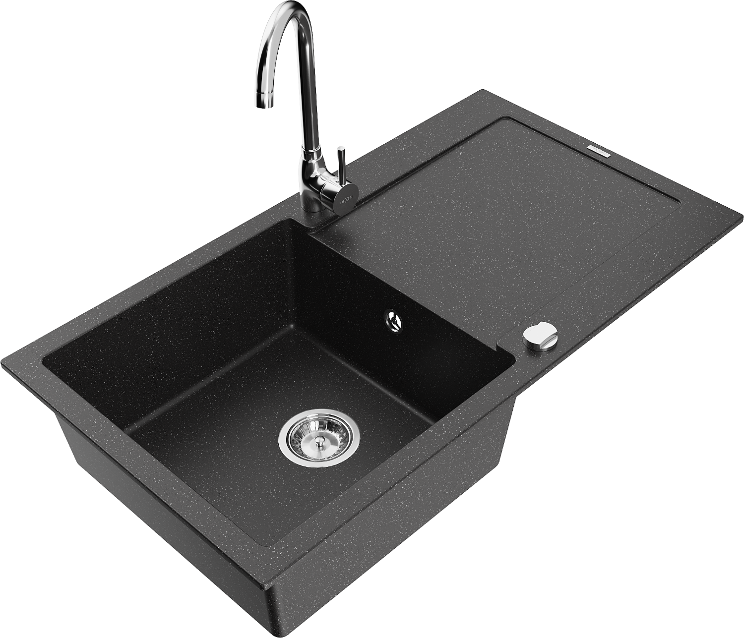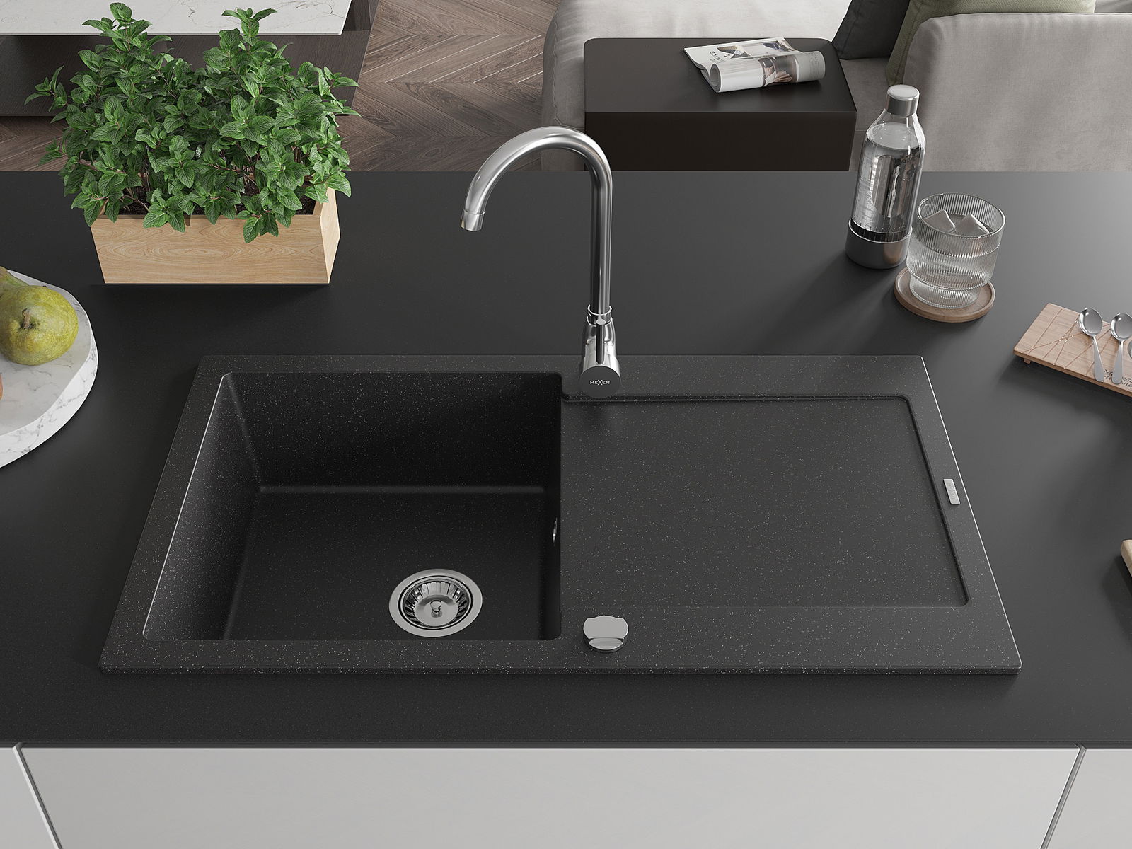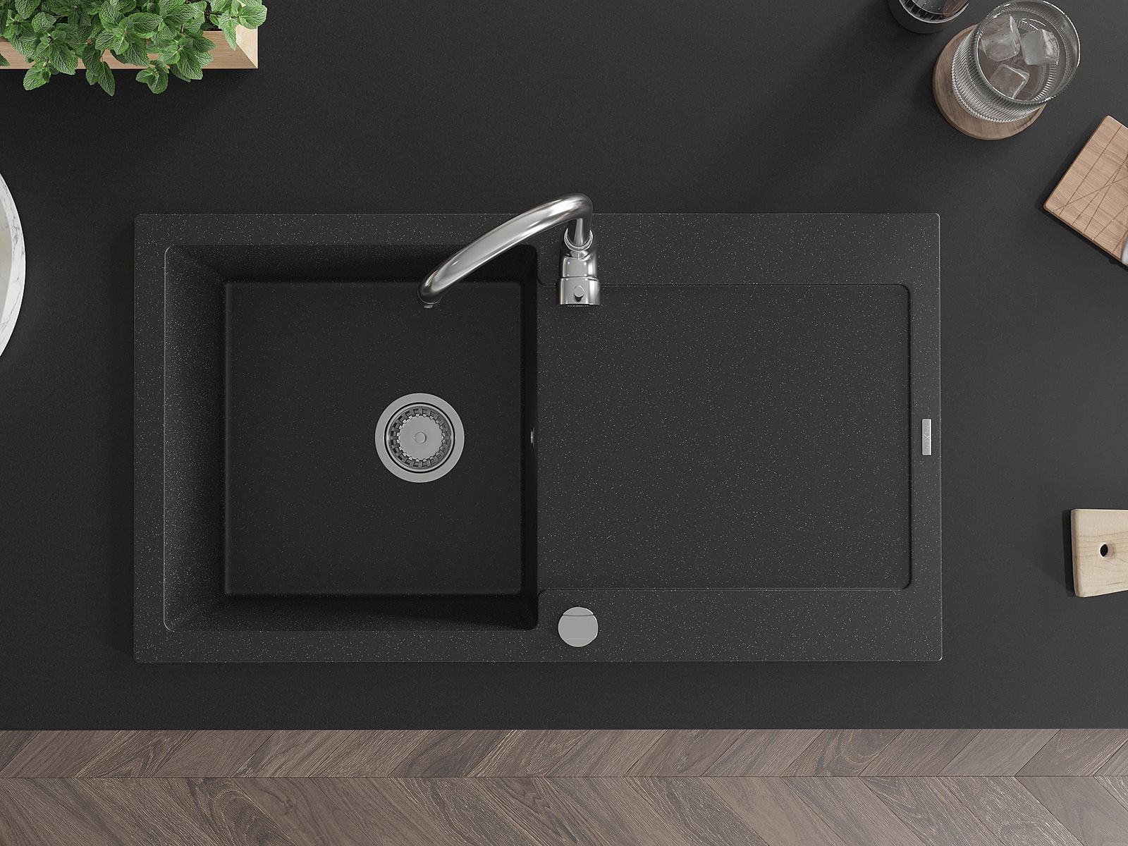 Mexen Leo chiuvetă de granit cu 1 compartiment cu scurgător și baterie de bucătărie Telma, negru/argintiu metalic