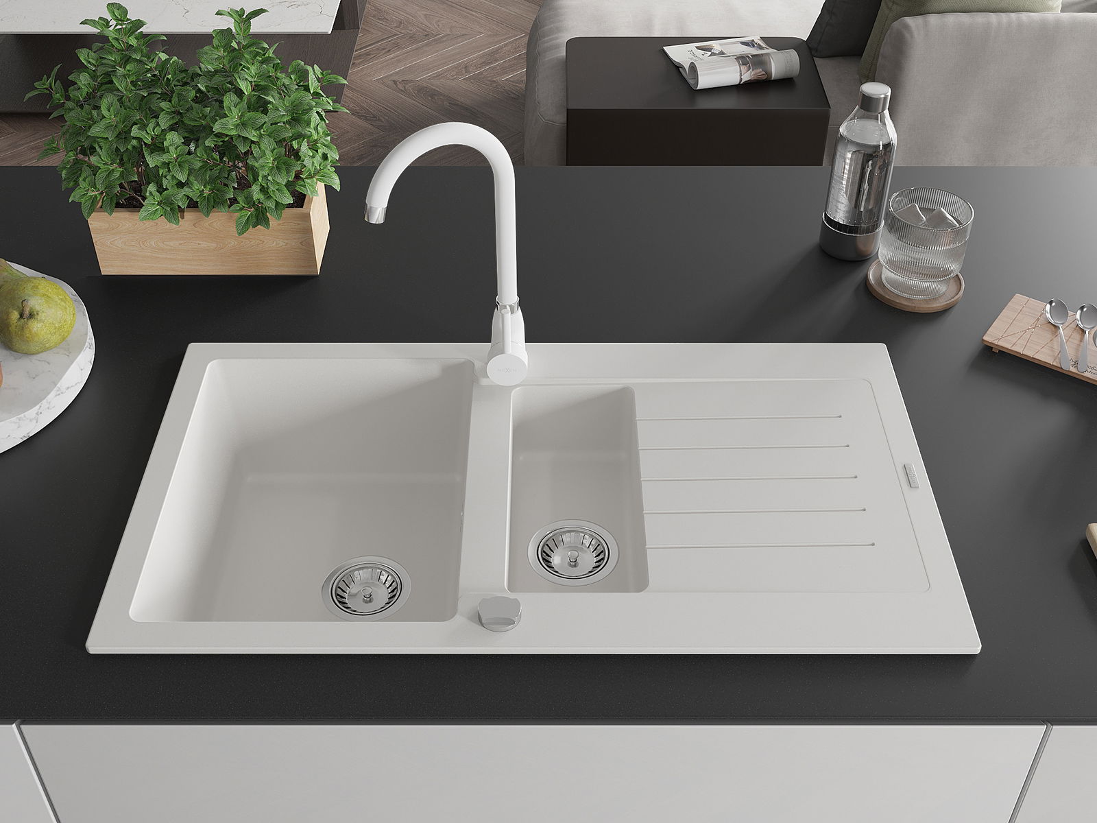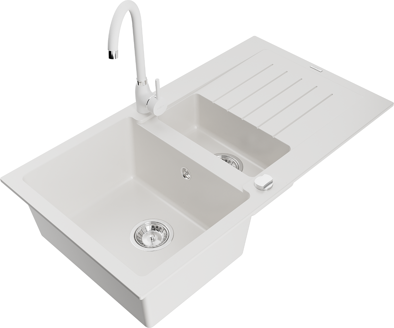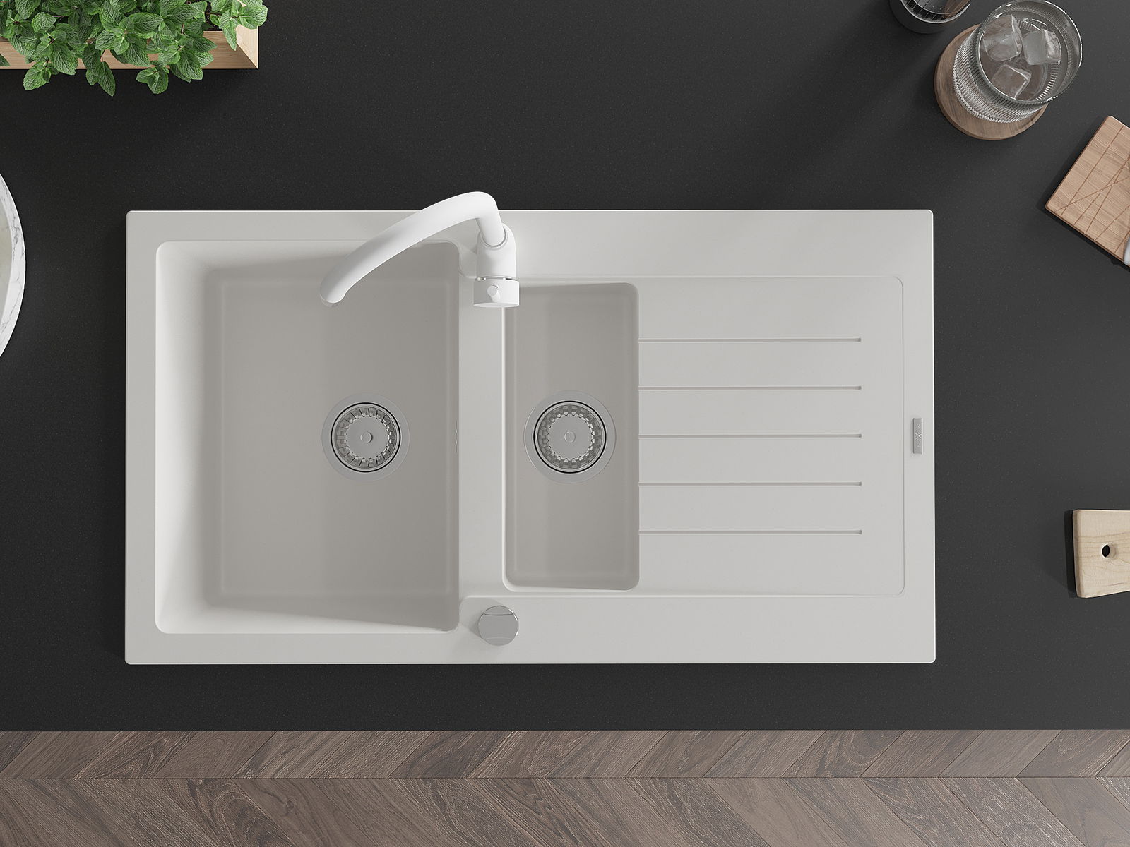 Mexen Matias chiuvetă din granit cu 1,5 compartimente cu scurgător și baterie de bucătărie Telma, alb - 6502-20-670200-20