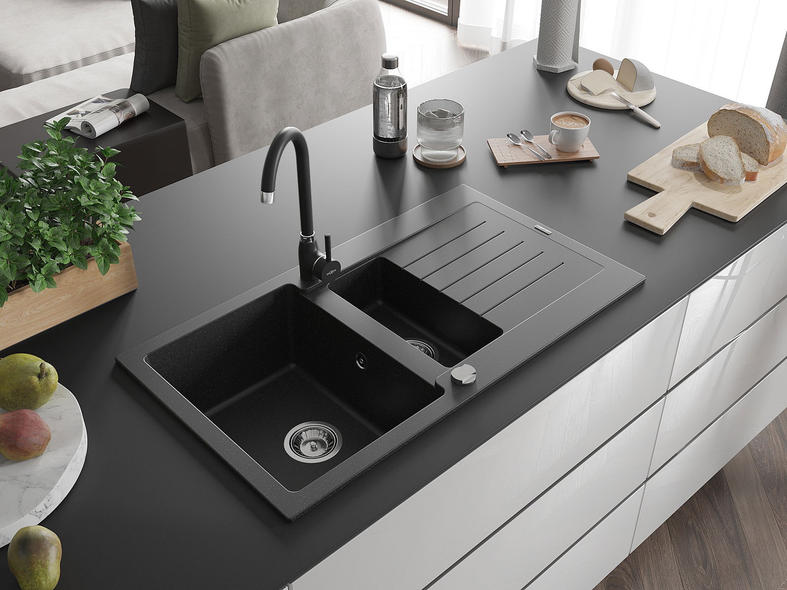 Mexen Matias chiuvetă de granit cu 1,5 cuve cu scurgător și baterie de bucătărie Telma, negru/argintiu - 6502-73-670200-70