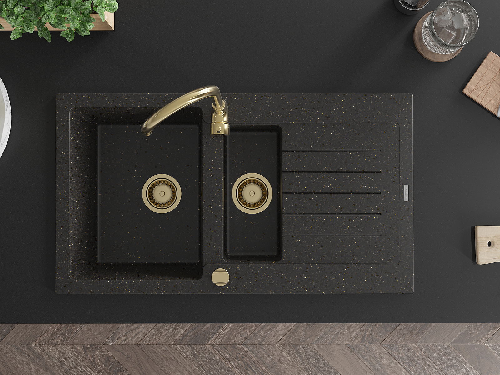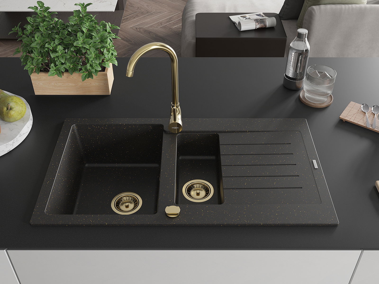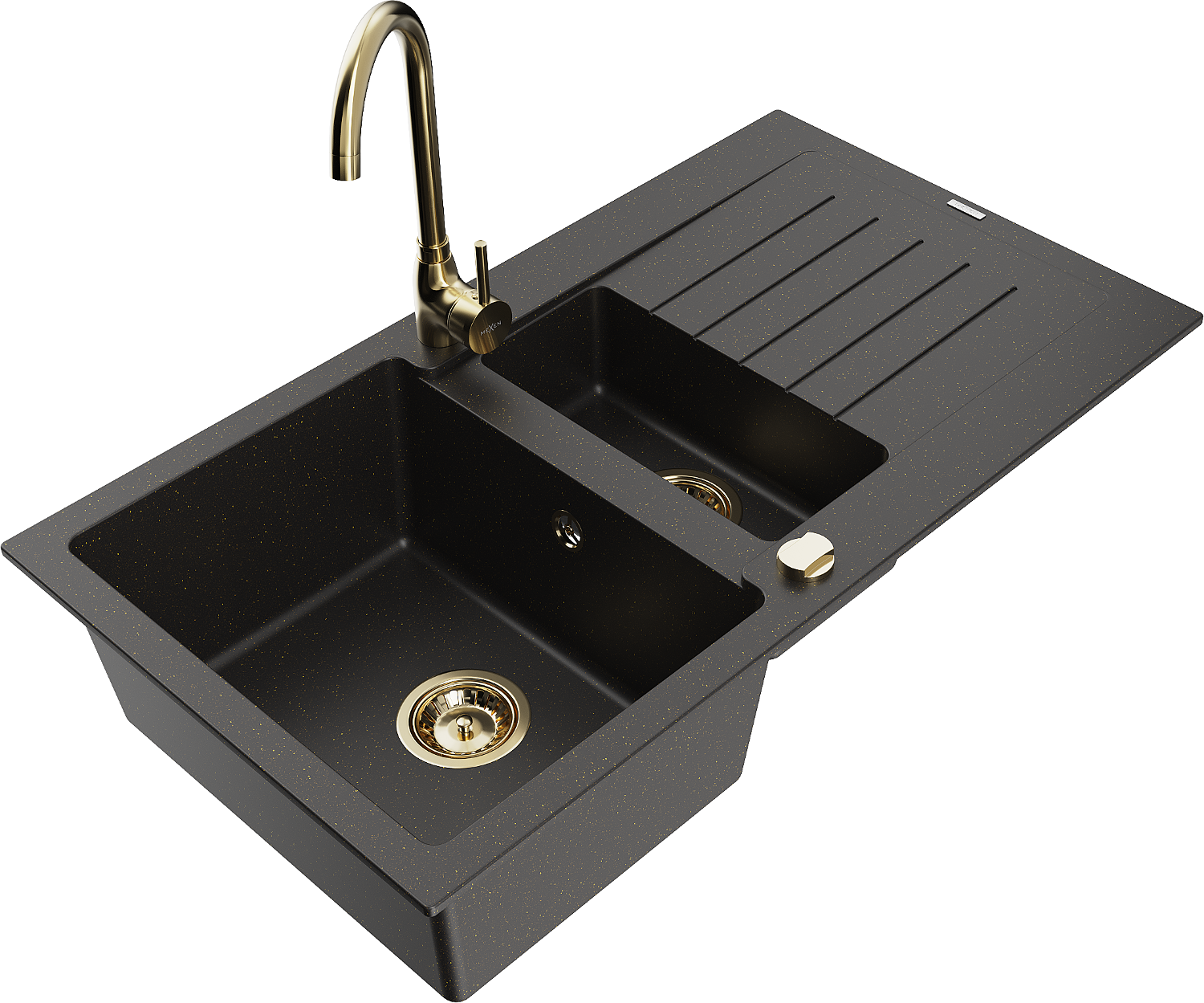Mexen Matias chiuvetă de granit cu 1,5 cuve, scurgător și baterie de bucătărie Telma, negru/auriu - 6502-75-670200-50