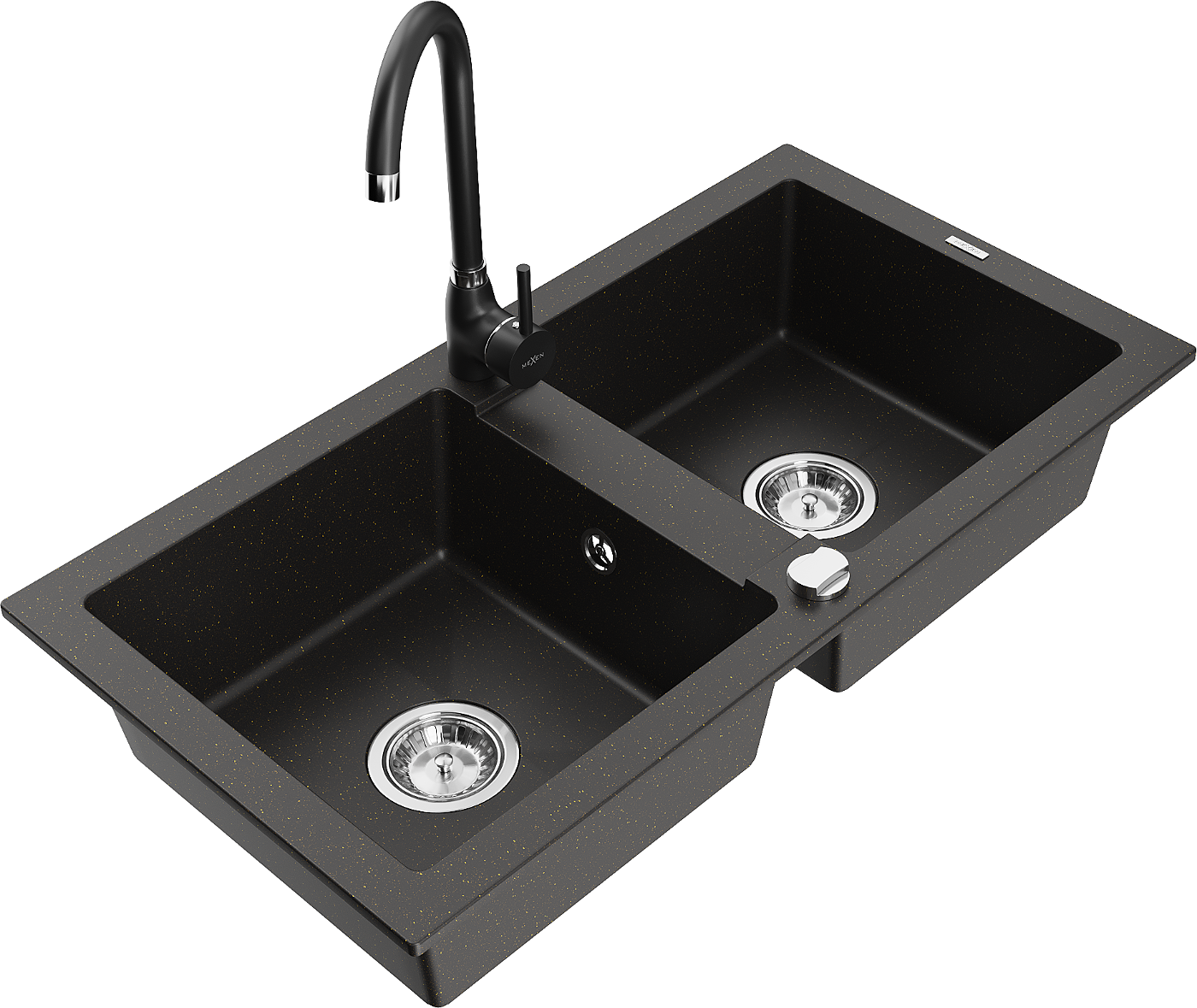 Mexen Mario chiuvetă de bucătărie din granit cu 2 compartimente cu baterie de bucătărie Telma, negru/auriu - 6504-75-670200-70