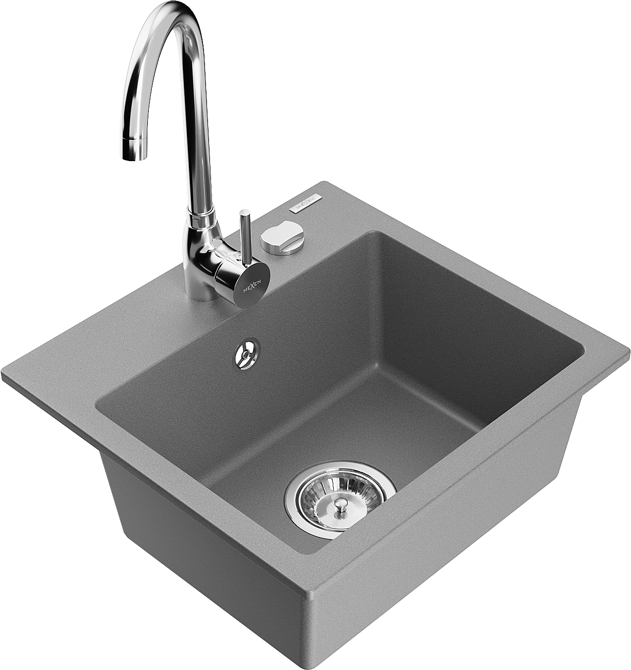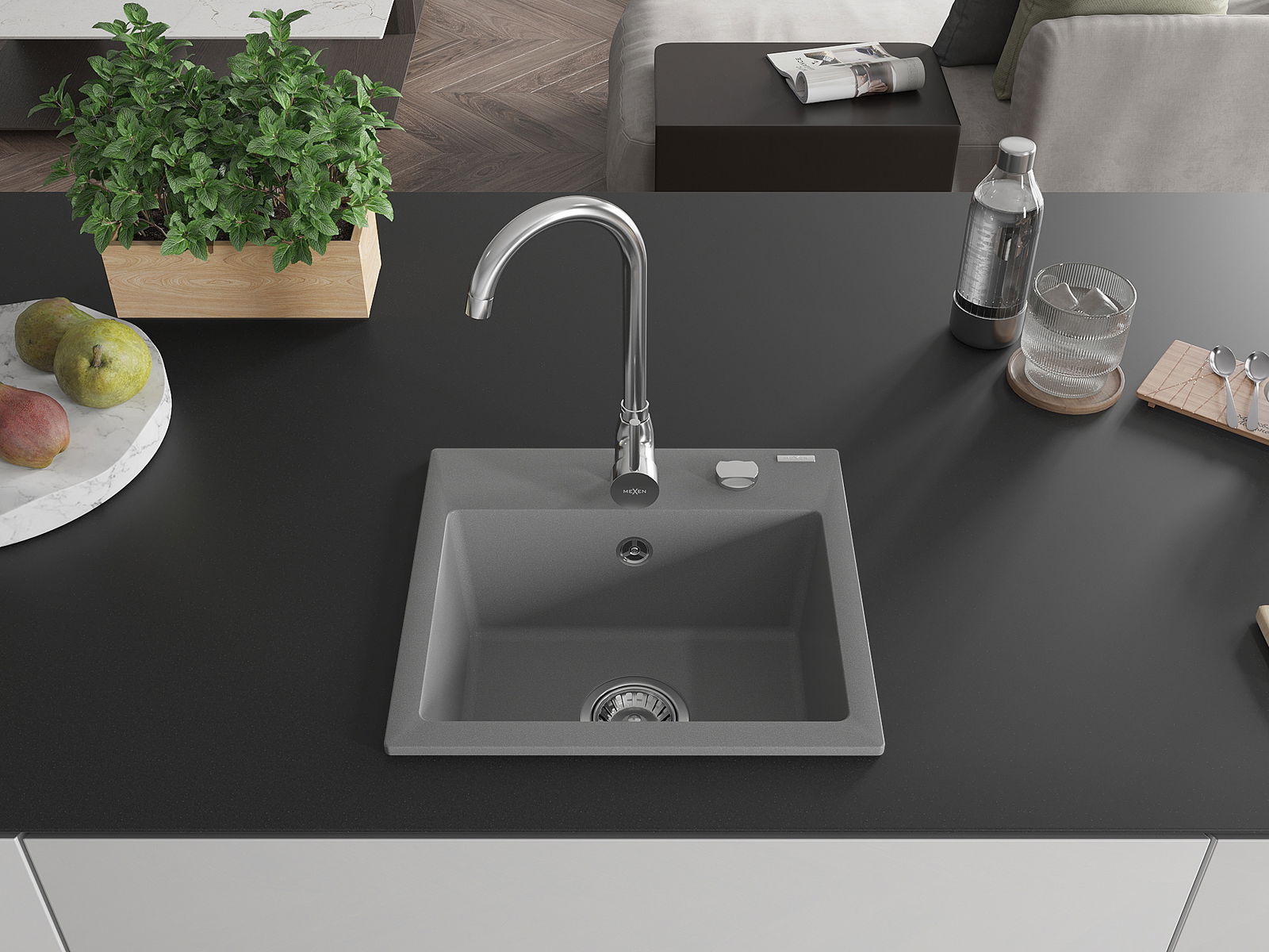 Mexen Milo chiuvetă de bucătărie din granit cu 1 compartiment și baterie de bucătărie Telma, gri - 6505-71-670200-00
