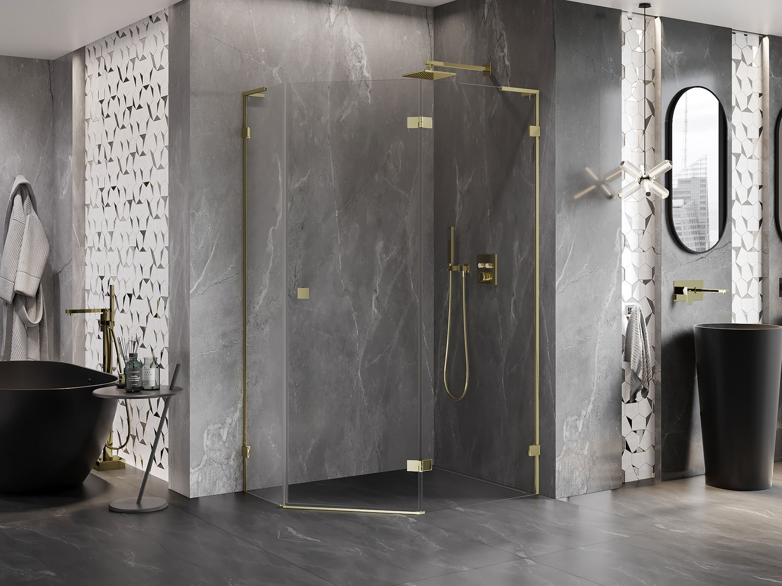 Mexen Lunar L cabină de duș pentagonală batantă dreapta 90 x 80 cm, transparent, auriu - 831L-090P-080L-50-00-P