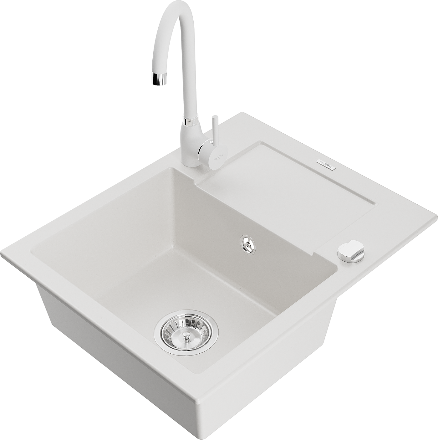 Mexen Enzo chiuvetă din granit, cu 1 cuvă și picurător și baterie de bucătărie Telma, alb - 6506-20-670200-20