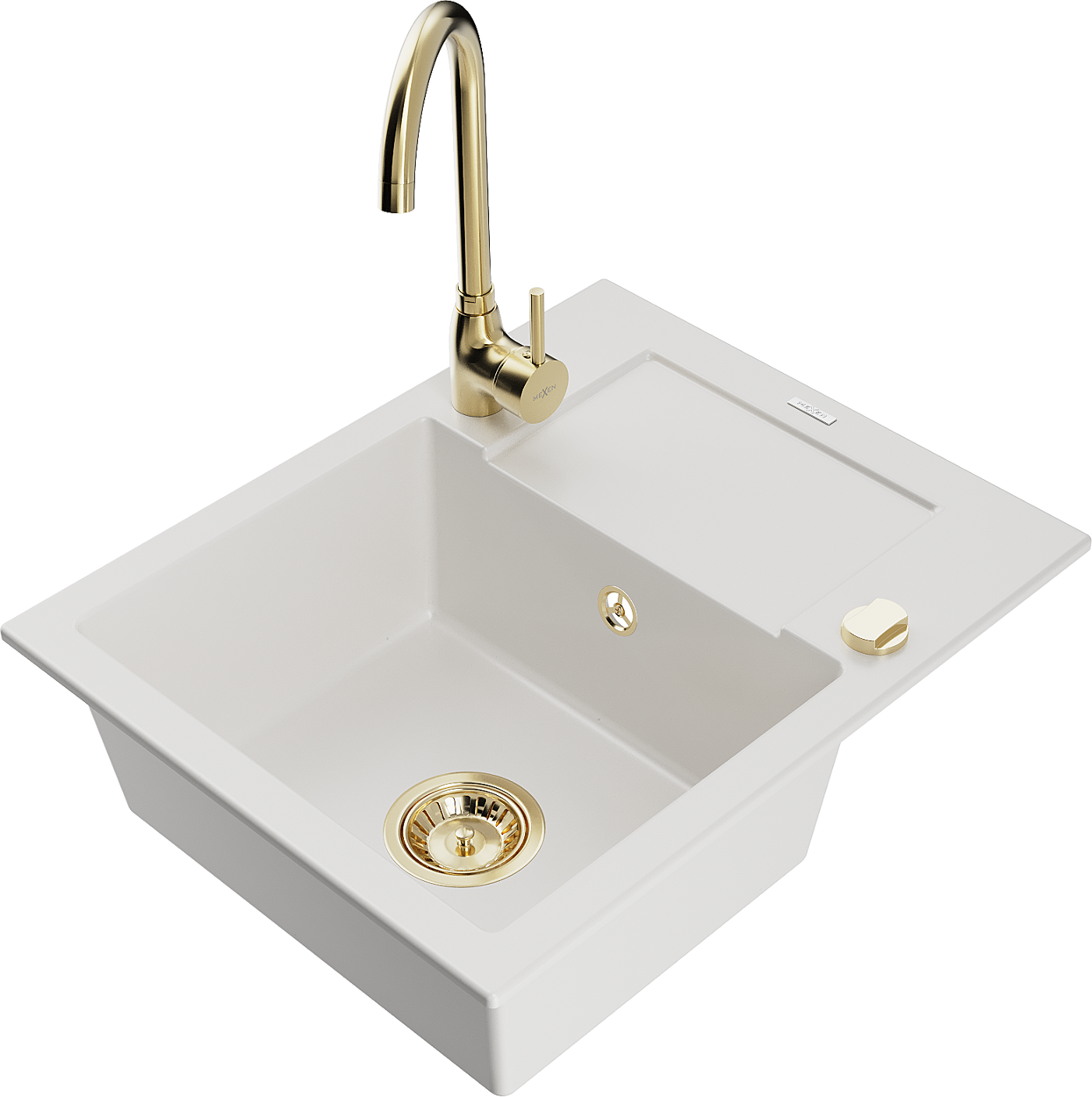 Mexen Enzo chiuvetă de granit cu 1 compartiment și picurător și baterie de bucătărie Telma, albă - 6506-20-670200-50