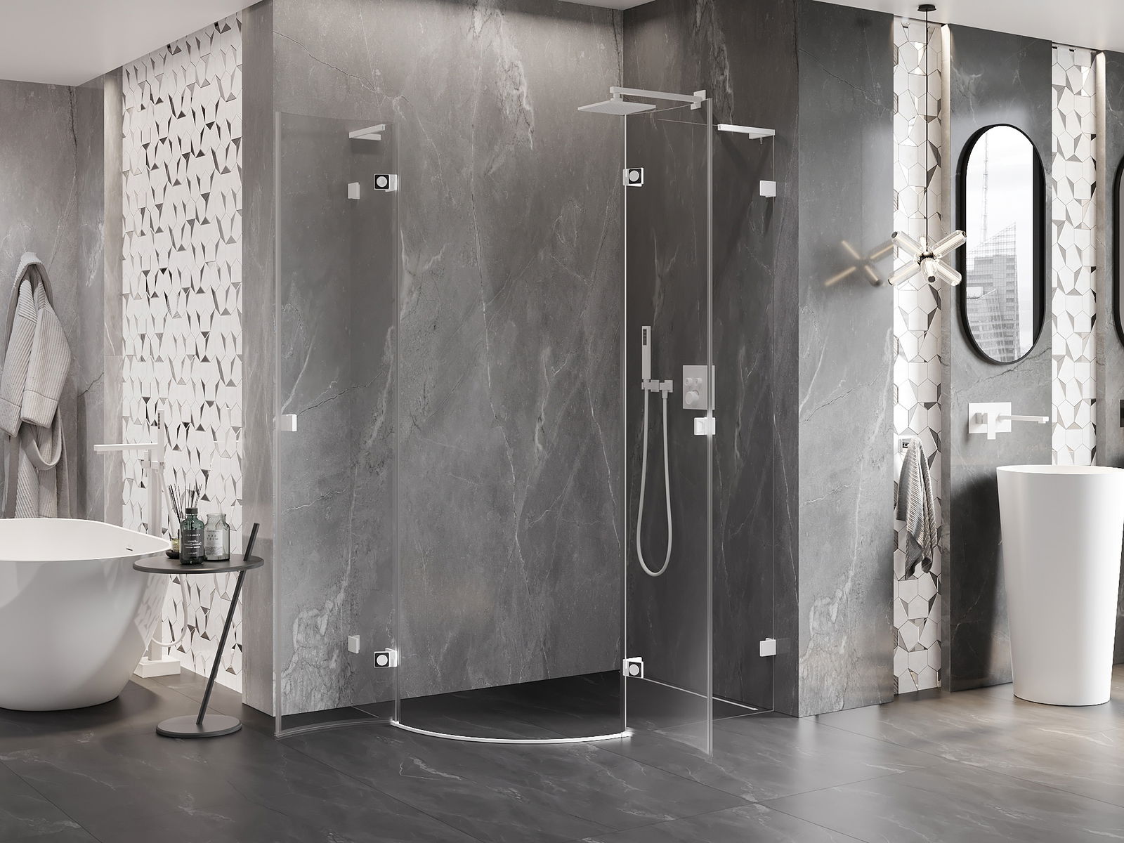 Mânerul practic și confortabil este realizat din metal durabil și rezistent. Forma modernă, combinată cu un finisaj asortat cu culoarea profilelor, conferă un aspect modern și elegant întregului, subliniind estetica fiecărei băi.