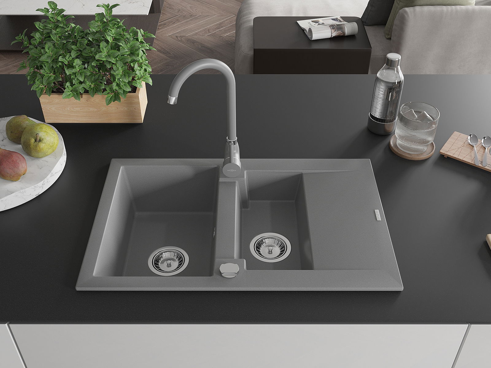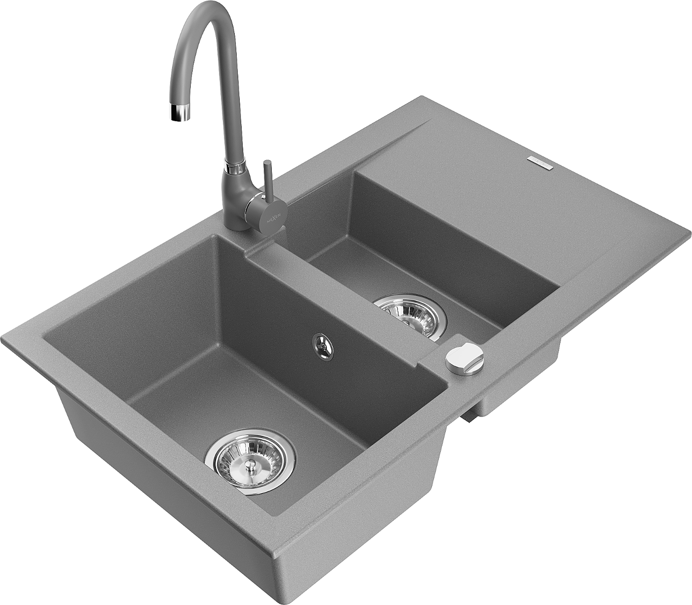 Mexen Gaspar chiuvetă din granit cu 1,5 compartimente cu scurgător și robinet de bucătărie Telma, gri - 6507-71-670200-71