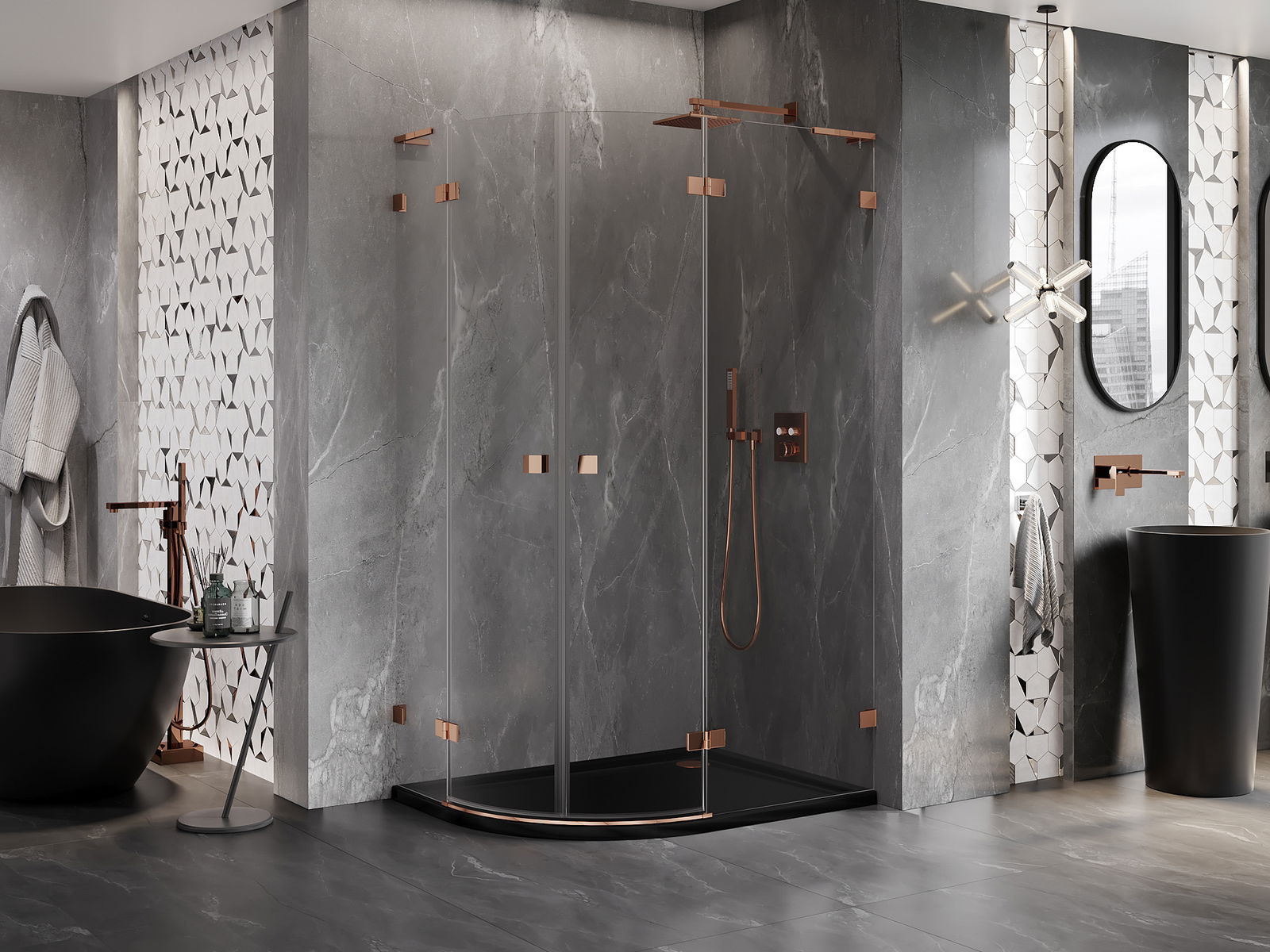 Mânerul practic și confortabil este realizat din metal durabil și rezistent. Forma modernă, combinată cu un finisaj asortat cu culoarea profilelor, conferă un aspect modern și elegant întregului, subliniind estetica fiecărei băi.