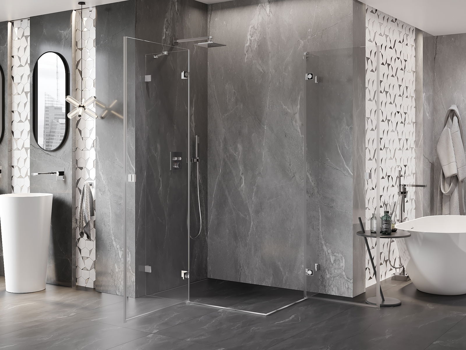 Mânerul practic și confortabil este realizat din metal durabil și rezistent. Forma modernă, combinată cu un finisaj asortat cu culoarea profilelor, conferă un aspect modern și elegant întregului, subliniind estetica fiecărei băi.