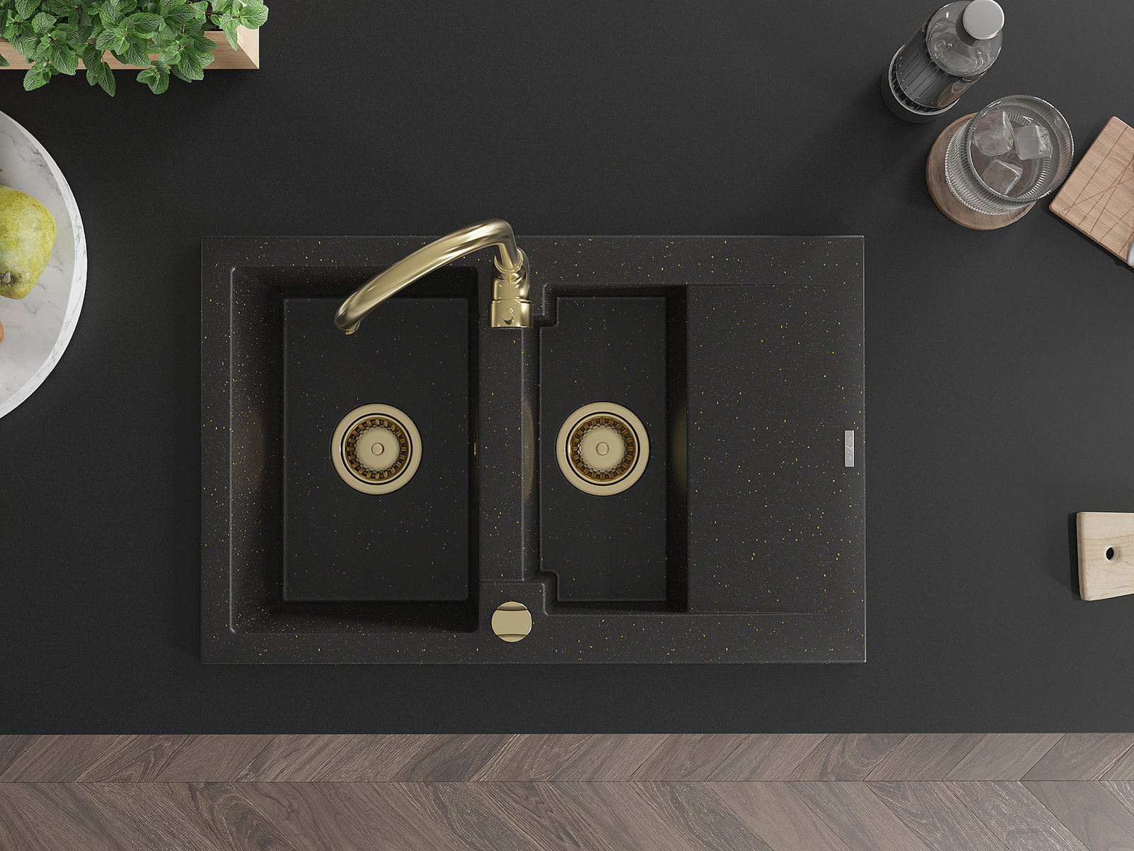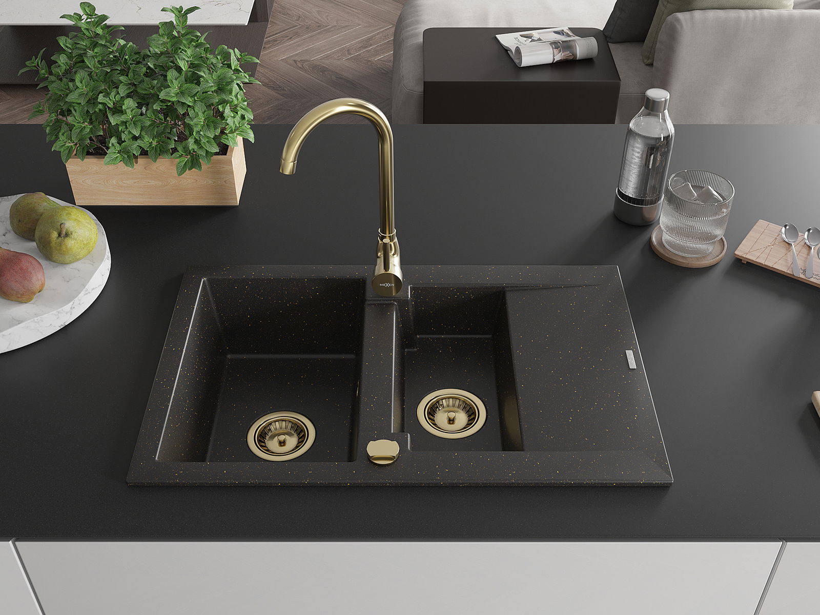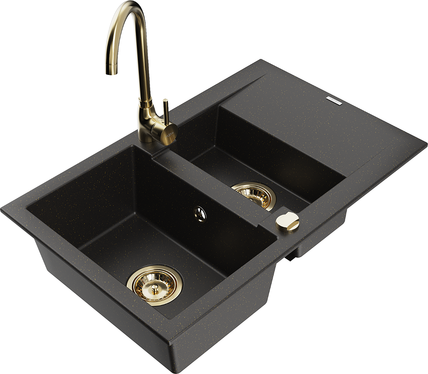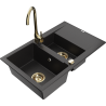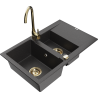 Mexen Gaspar chiuvetă din granit cu 1,5 compartimente, cu scurgător și baterie de bucătărie Telma, negru/auriu