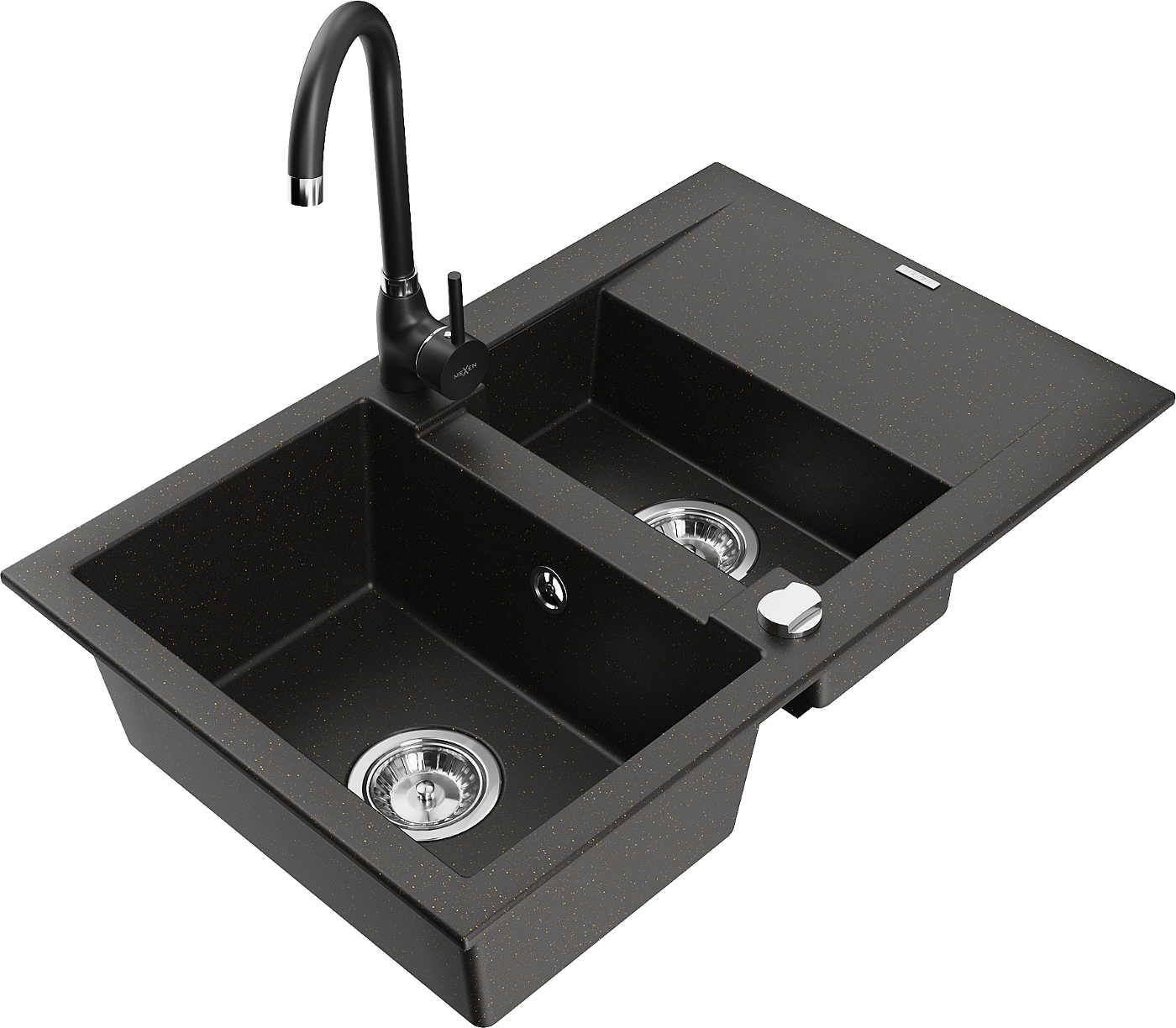 Mexen Gaspar chiuvetă din granit 1,5 camere cu scurgător și baterie de bucătărie Telma, negru/auriu - 6507-75-670200-70