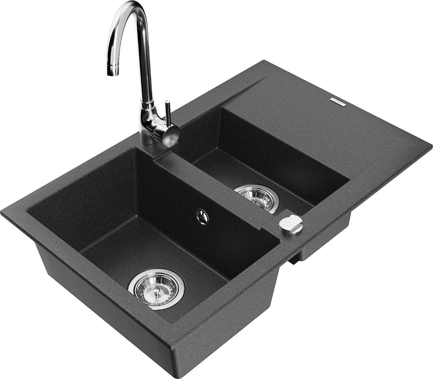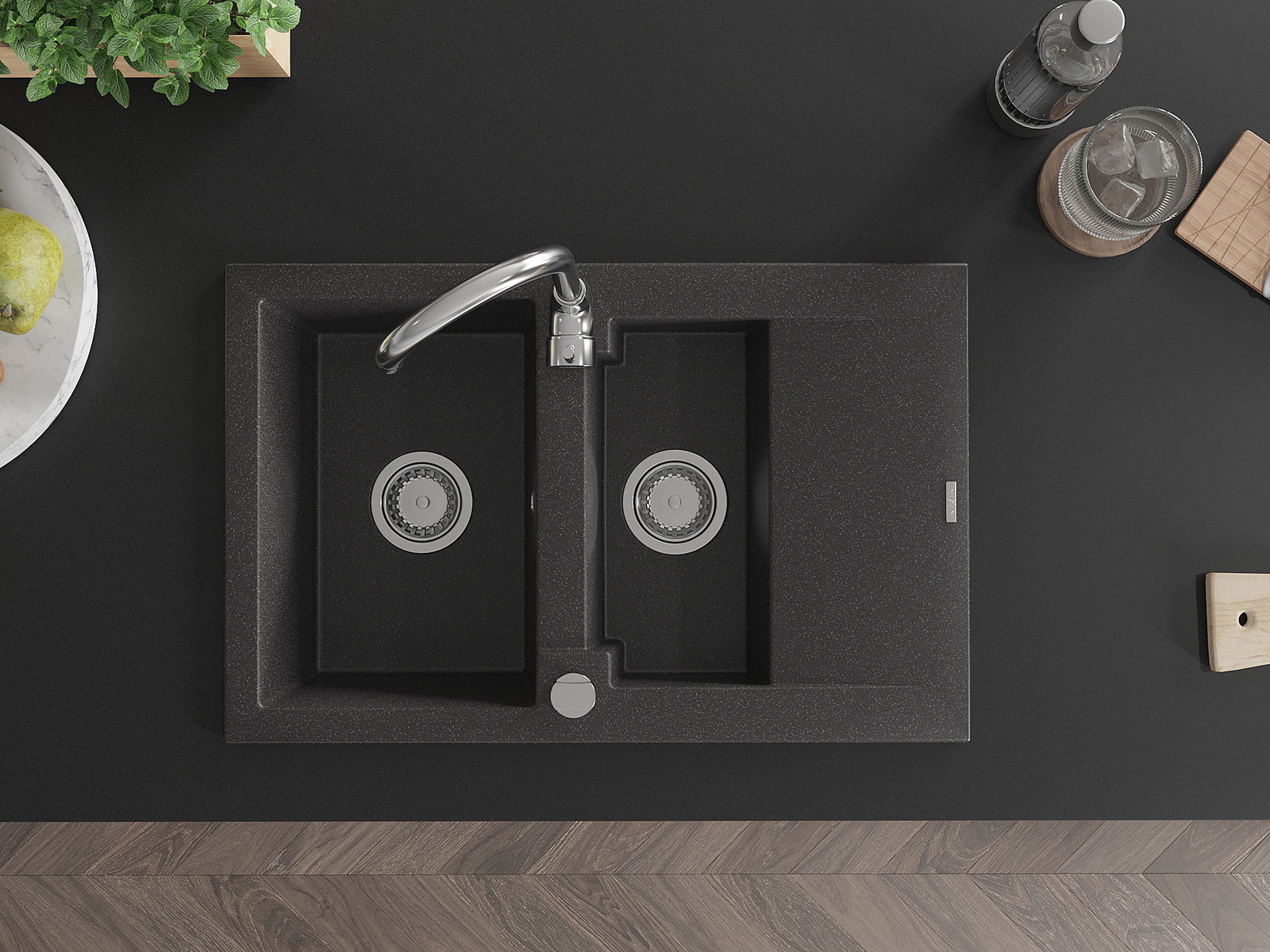 Mexen Gaspar chiuvetă de bucătărie din granit cu 1,5 compartimente, cu scurgător și baterie Telma, negru cu stropi