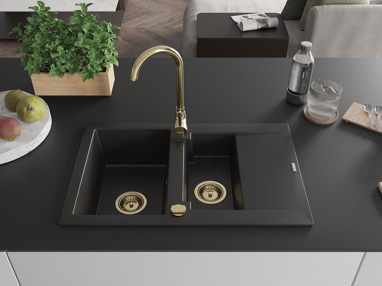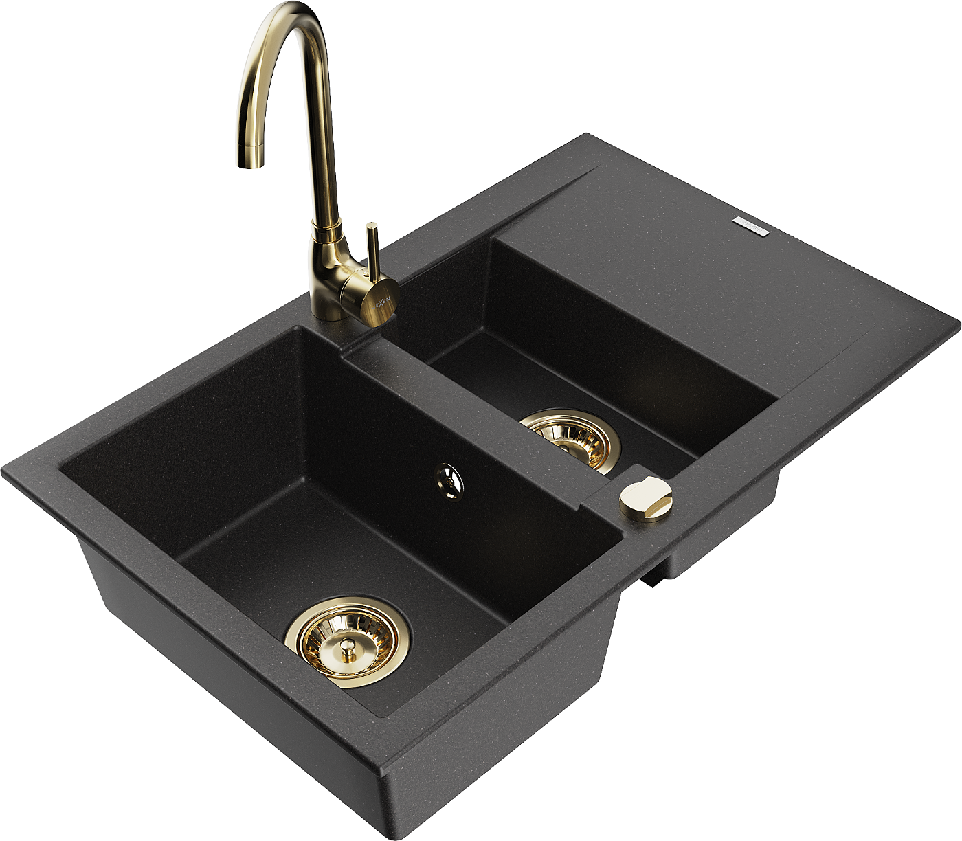 Mexen Gaspar chiuvetă de granit cu 1,5 compartimente și scurgere, cu baterie de bucătărie Telma, negru - 6507-77-670200-50
