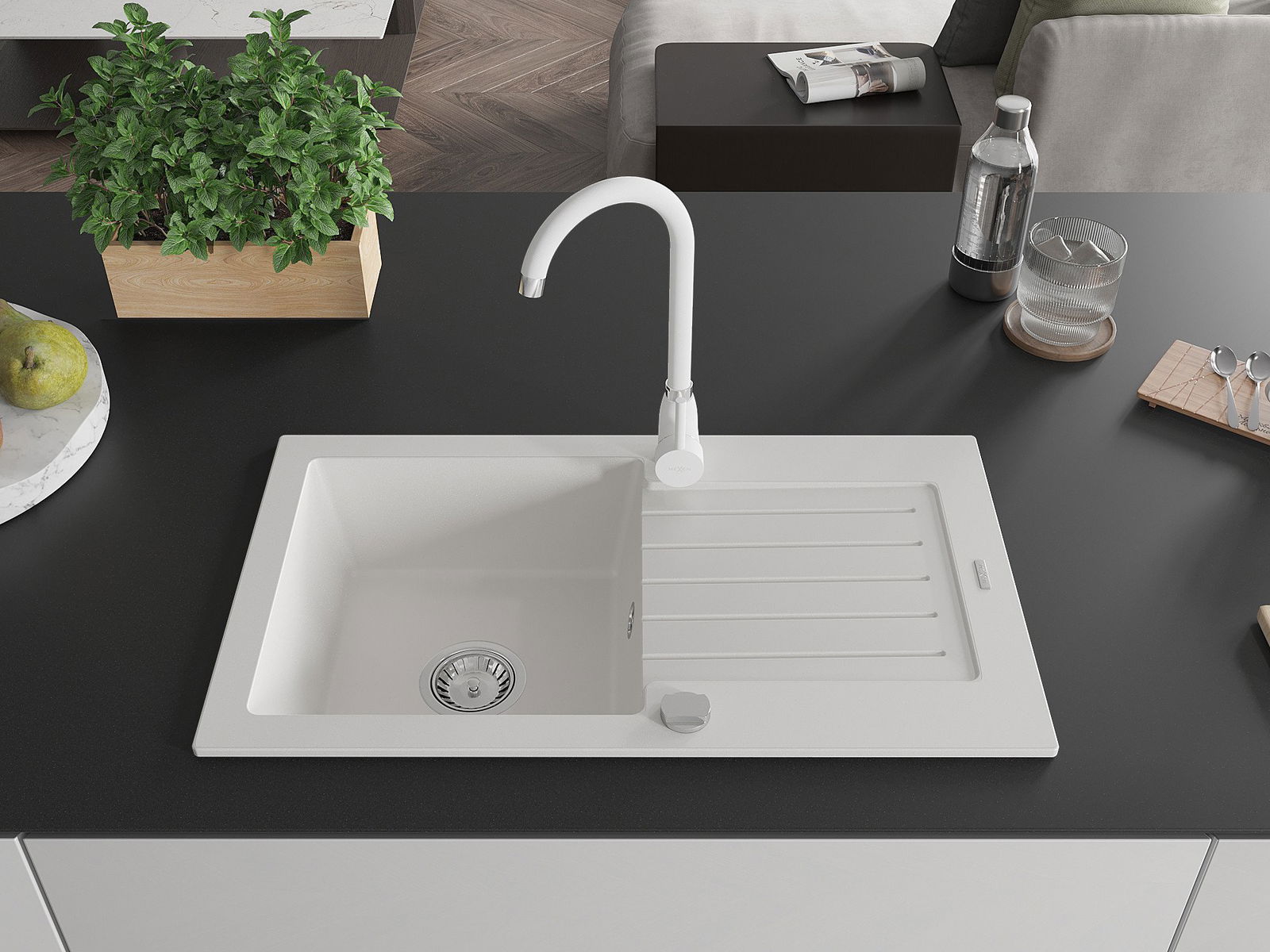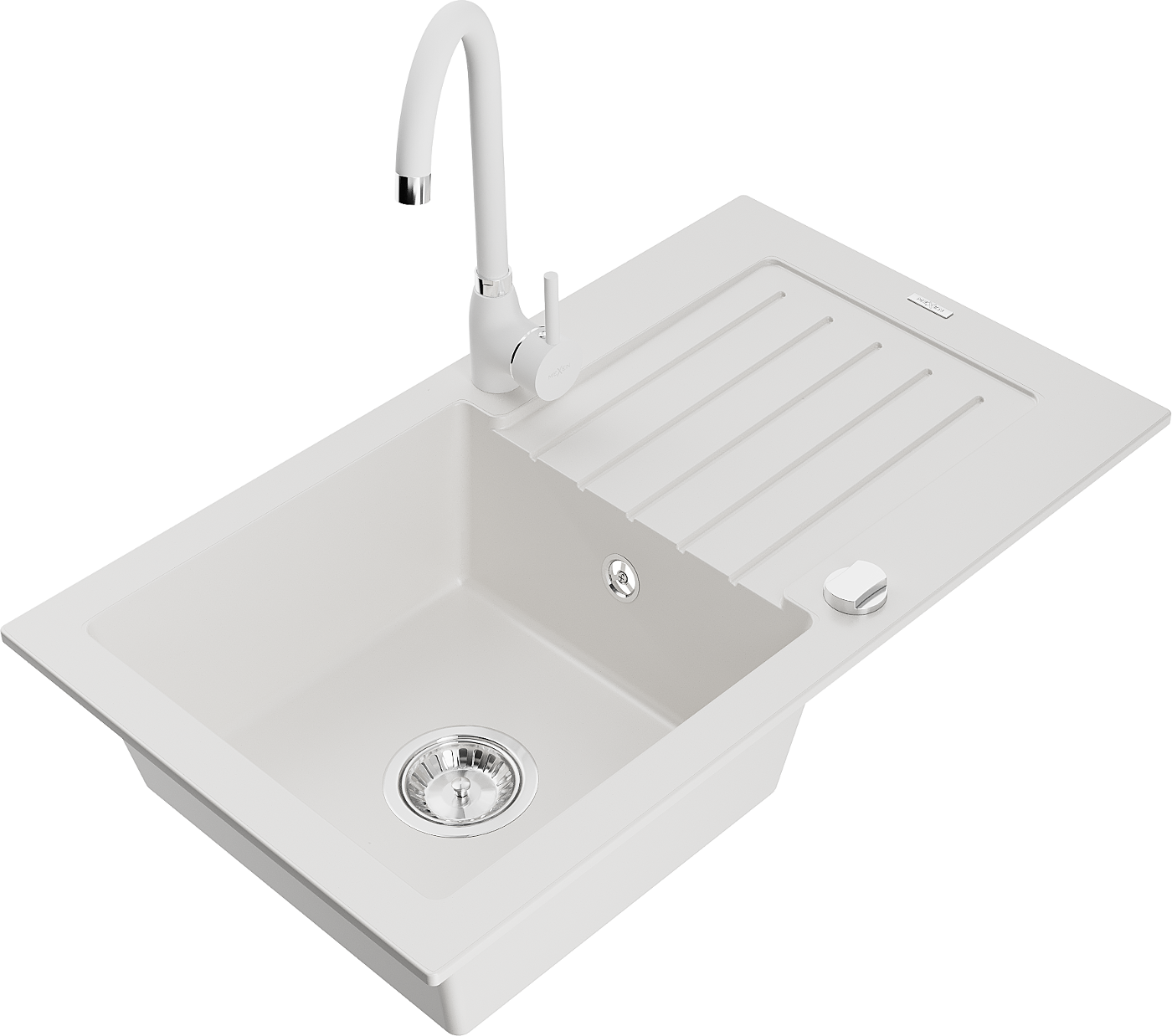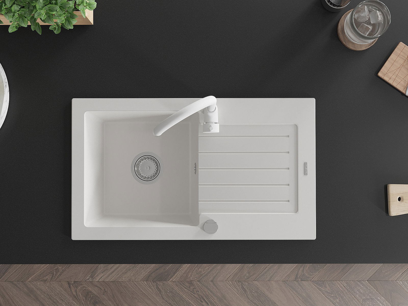 Mexen Pablo chiuvetă de bucătărie din granit 1-cameră cu scurgător și baterie de bucătărie Telma, alb - 6510-20-670200-20