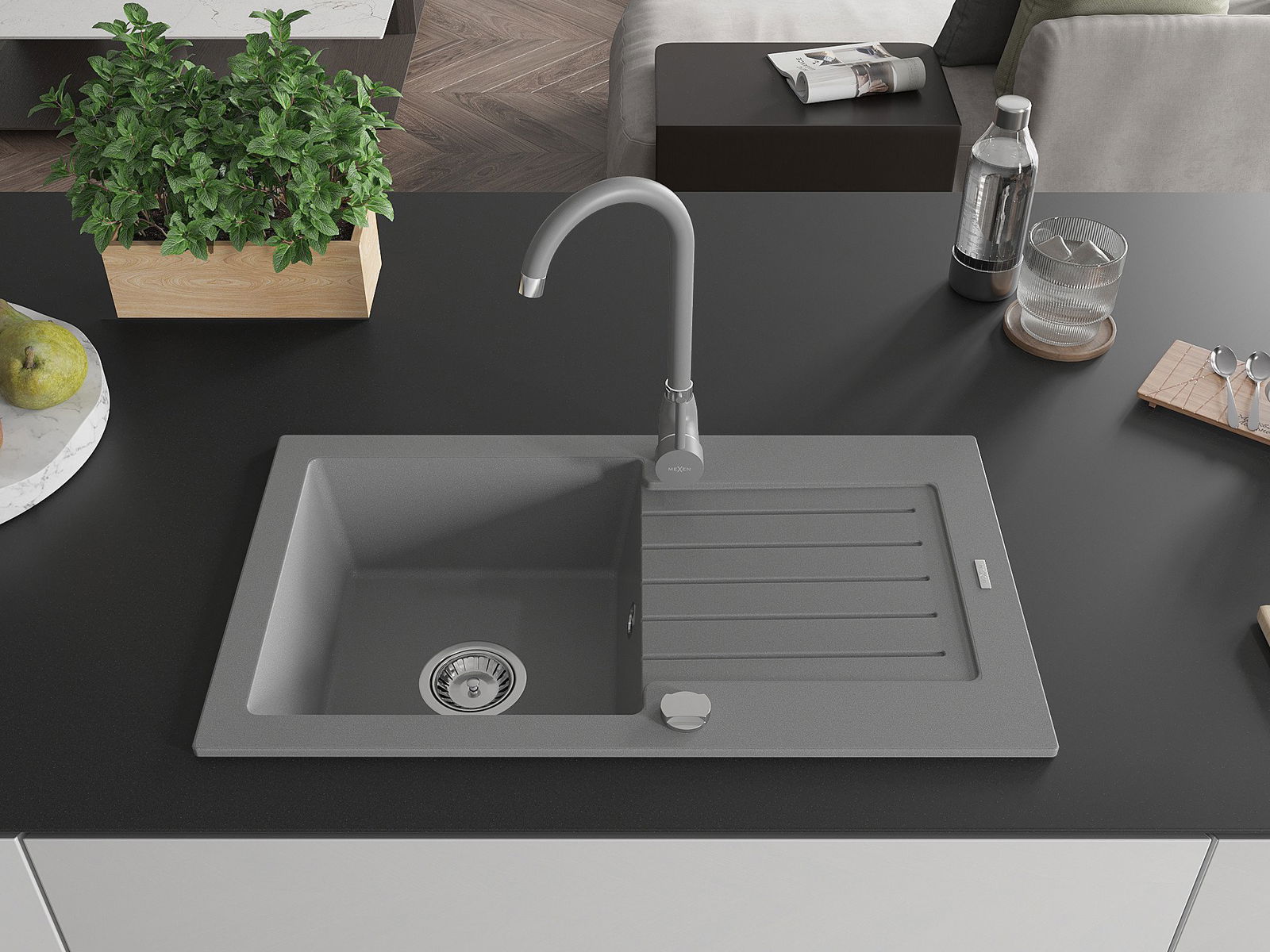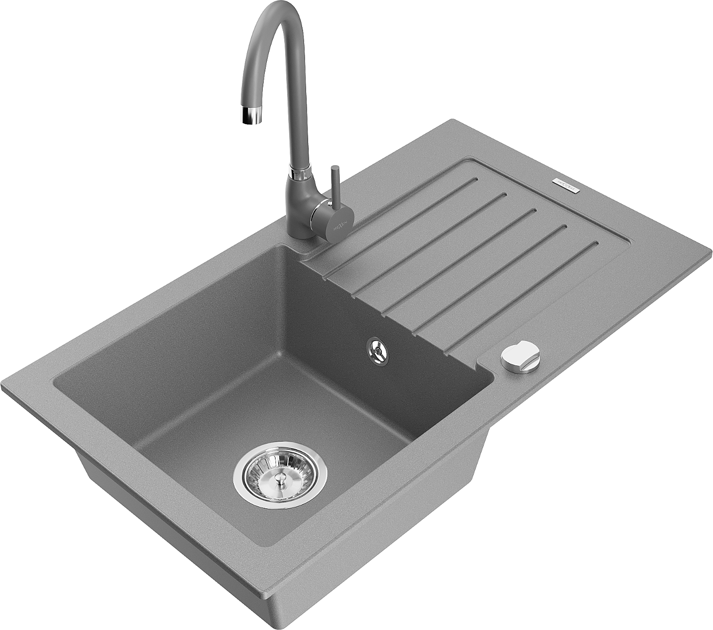 Mexen Pablo chiuvetă de granit 1-cameră cu scurgător și baterie de bucătărie Telma, gri - 6510-71-670200-71